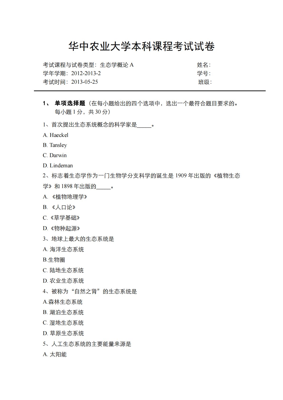 华中农业大学本科课程考试试卷考试课程与试卷类型:生态学概论A姓名:学年学期:2012-2013-2学号:考试时间:2013-05-25班级:1、单项选择题(在每小题给出的四个选项中,选出一个最符合题目要求的。每小题1分,共30分)1、首次提出生态系统概念的科学家是_____。A.HaeckelB.TansleyC.DarwinD.Lindeman2、标志着生态学作为一门生物学分支科学的诞生是1909年出版的《植物生态学》和1898年出版的_____。A.《植物地理学》B.《人口论》C.《草学基础》D.《物种起源》3、地球上最大的生态系统是A.海洋生态系统B.生物圈C.陆地生态系统D.农业生态系...
