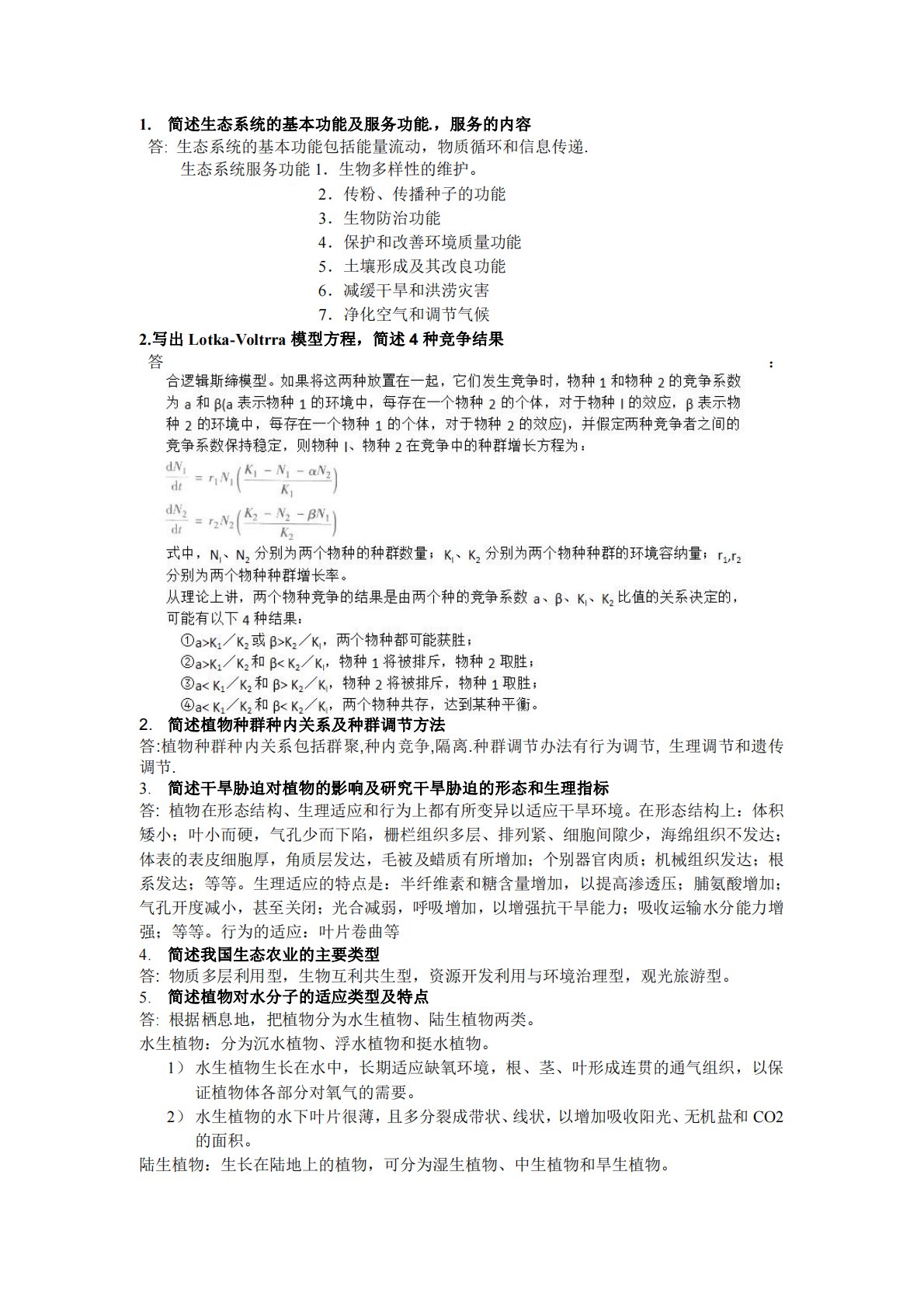 1.简述生态系统的基本功能及服务功能.,服务的内容答:生态系统的基本功能包括能量流动,物质循环和信息传递.生态系统服务功能1.生物多样性的维护。2.传粉、传播种子的功能3.生物防治功能4.保护和改善环境质量功能5.土壤形成及其改良功能6.减缓干旱和洪涝灾害7.净化空气和调节气候2.写出Lotka-Voltrra模型方程,简述4种竞争结果答:2.简述植物种群种内关系及种群调节方法答:植物种群种内关系包括群聚,种内竞争,隔离.种群调节办法有行为调节,生理调节和遗传调节.3.简述干旱胁迫对植物的影响及研究干旱胁迫的形态和生理指标答:植物在形态结构、生理适应和行为上都有所变异以适应干旱环境。在形态结构...