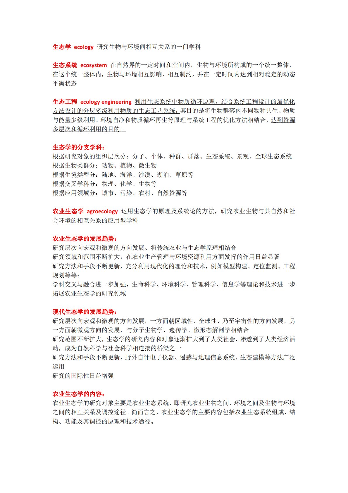 生态学ecology研究生物与环境间相互关系的一门学科生态系统ecosystem在自然界的一定时间和空间内,生物与环境所构成的一个统一整体,在这个统一整体内,生物与环境相互影响、相互制约,并在一定时间内达到相对稳定的动态平衡状态生态工程ecologyengineering利用生态系统中物质循环原理,结合系统工程设计的最优化方法设计的分层多级利用物质的生态工艺系统,其目的是将生物群落内不同物种共生、物质与能量多级利用、环境自净和物质循环再生等原理与系统工程的优化方法相结合,达到资源多层次和循环利用的目的。生态学的分支学科:根据研究对象的组织层次分:分子、个体、种群、群落、生态系统、景观、全球生态...