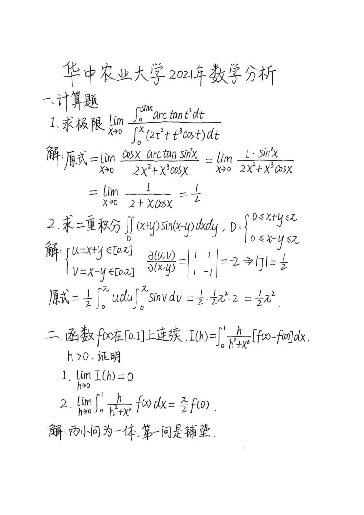 华中农业大学628数学分析2021年真题