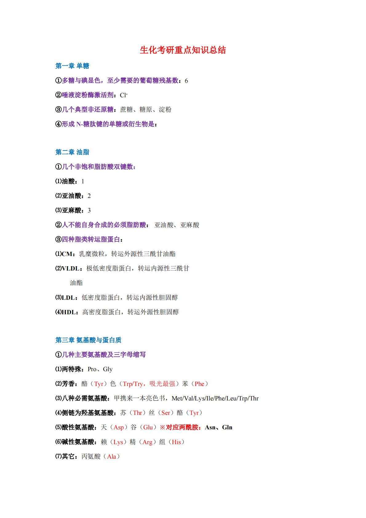生化考研重点知识总结第一章单糖①多糖与碘显色,至少需要的葡萄糖残基数:6②唾液淀粉酶激活剂:Cl-③几个典型非还原糖:蔗糖、糖原、淀粉④形成N-糖肽键的单糖或衍生物是:第二章油脂①几个非饱和脂肪酸双键数:⑴油酸:1⑵亚油酸:2⑶亚麻酸:3②人不能自身合成的必须脂肪酸:亚油酸、亚麻酸③四种脂类转运脂蛋白:⑴CM:乳糜微粒,转运外源性三酰甘油酯⑵VLDL:极低密度脂蛋白,转运内源性三酰甘油酯⑶LDL:低密度脂蛋白,转运内源性胆固醇⑷HDL:高密度脂蛋白,转运外源性胆固醇第三章氨基酸与蛋白质①几种主要氨基酸及三字母缩写⑴两特殊:Pro、Gly⑵芳香:酪(Tyr)色(Trp/Try,吸光最强)苯(Ph...