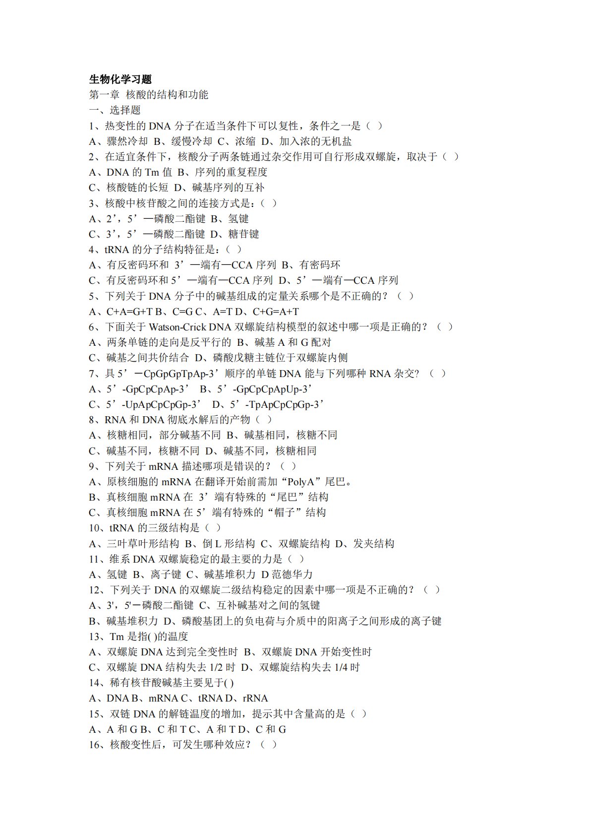 生物化学习题第一章核酸的结构和功能一、选择题1、热变性的DNA分子在适当条件下可以复性,条件之一是()A、骤然冷却B、缓慢冷却C、浓缩D、加入浓的无机盐2、在适宜条件下,核酸分子两条链通过杂交作用可自行形成双螺旋,取决于()A、DNA的Tm值B、序列的重复程度C、核酸链的长短D、碱基序列的互补3、核酸中核苷酸之间的连接方式是:()A、2’,5’—磷酸二酯键B、氢键C、3’,5’—磷酸二酯键D、糖苷键4、tRNA的分子结构特征是:()A、有反密码环和3’—端有—CCA序列B、有密码环C、有反密码环和5’—端有—CCA序列D、5’—端有—CCA序列5、下列关于DNA分子中的碱基组成的定量关系哪个是...