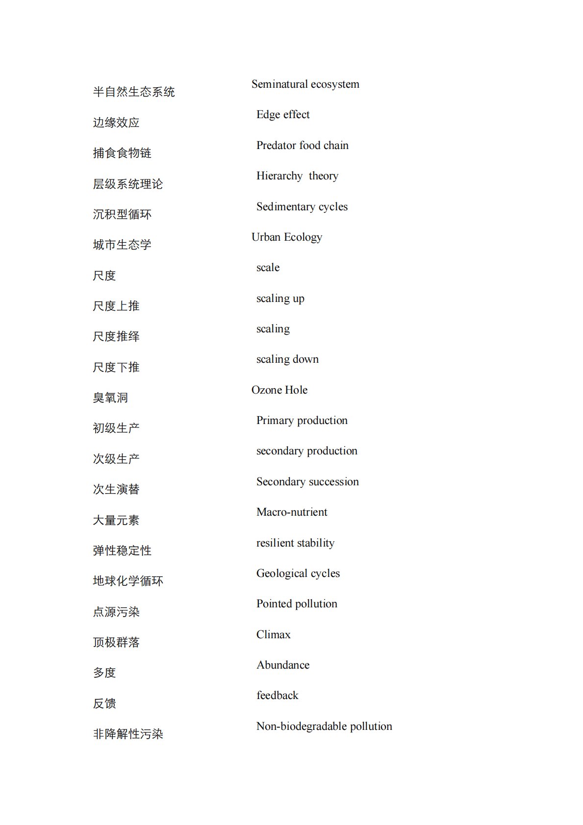 半自然生态系统Seminaturalecosystem边缘效应Edgeeffect捕食食物链Predatorfoodchain层级系统理论Hierarchytheory沉积型循环Sedimentarycycles城市生态学UrbanEcology尺度scale尺度上推scalingup尺度推绎scaling尺度下推scalingdown臭氧洞OzoneHole初级生产Primaryproduction次级生产secondaryproduction次生演替Secondarysuccession大量元素Macro-nutrient弹性稳定性resilientstability地球化学循环Geolo...