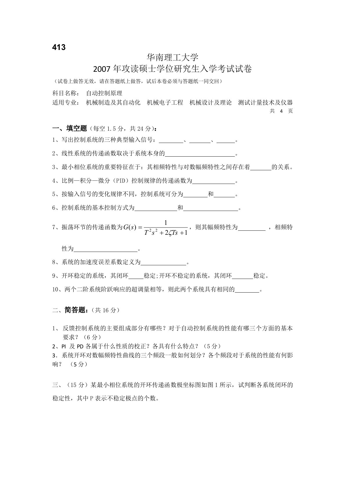 413华南理工大学2007年攻读硕士学位研究生入学考试试卷(试卷上做答无效,请在答题纸上做答,试后本卷必须与答题纸一同交回)科目名称:自动控制原理适用专业:机械制造及其自动化机械电子工程机械设计及理论测试计量技术及仪器共4页一、填空题(每空1.5分,共24分):1、写出控制系统的三种典型输入信号:、、。2、线性系统的传递函数取决于系统本身的。3、最小相位系统的重要特征在于:其相频特性与对数幅频特性之间存在着的关系。4、比例—积分—微分(PID)控制规律的传递函数为。5、按输入信号的变化规律不同,控制系统可分为和。6、控制系统的基本控制方式为和。7、振荡环节的传递函数为,则其幅频特性为,相频特性...