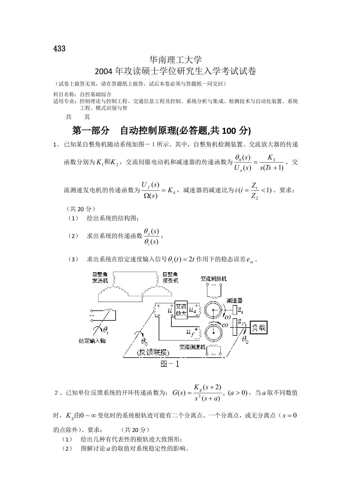 433华南理工大学2004年攻读硕士学位研究生入学考试试卷(试卷上做答无效,请在答题纸上做答,试后本卷必须与答题纸一同交回)科目名称:自控基础综合适用专业:控制理论与控制工程、交通信息工程及控制、系统分析与集成、检测技术与自动化装置、系统工程、模式识别与智共页第一部分自动控制原理(必答题,共100分)已知某自整角机随动系统如图-1所示。其中,自整角机检测装置、交流放大器的传递函数分别为,交流伺服电动机和减速器的传递函数为,交流测速发电机的传递函数为,减速器的减速比为。要求: (共20分)绘出系统的结构图; 求出系统的传递函数;求出系统在给定速度输入信号作用下的稳态误差。2、已知单位反馈系统...
