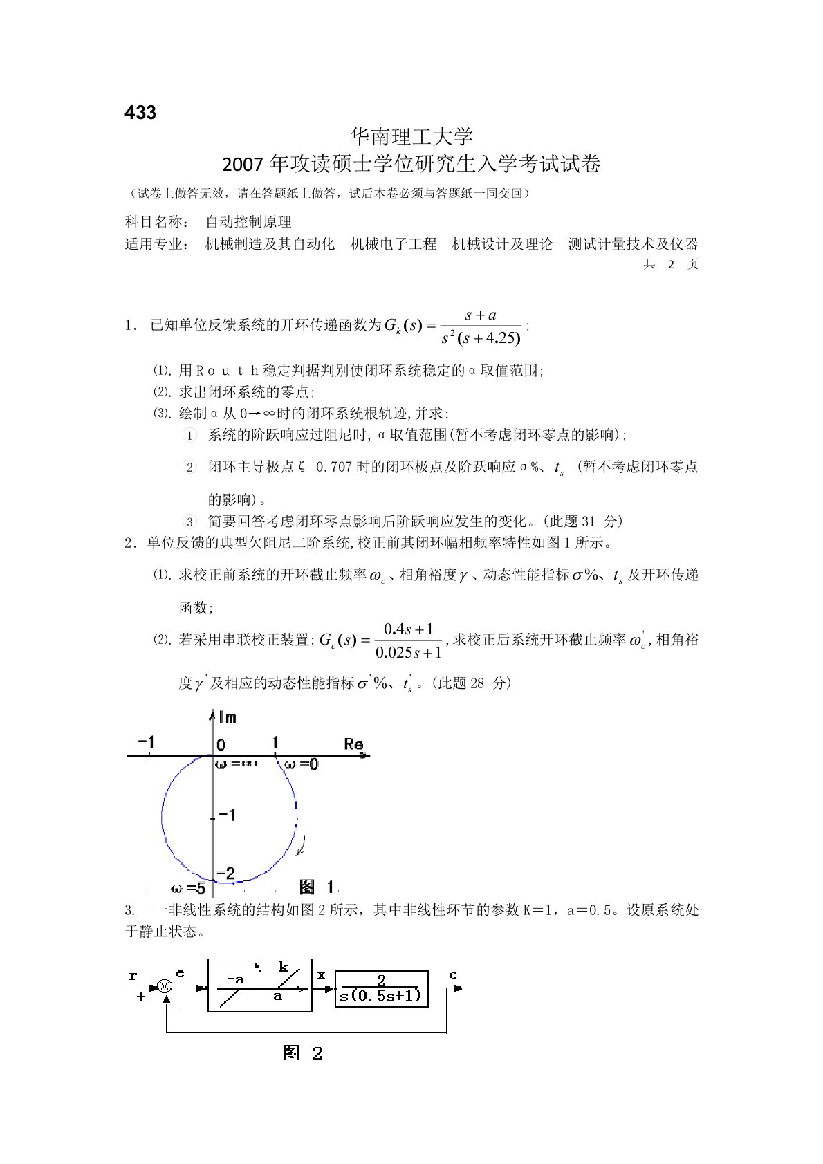 433华南理工大学2007年攻读硕士学位研究生入学考试试卷(试卷上做答无效,请在答题纸上做答,试后本卷必须与答题纸一同交回)科目名称:自动控制原理适用专业:机械制造及其自动化机械电子工程机械设计及理论测试计量技术及仪器共2页已知单位反馈系统的开环传递函数为;用Routh稳定判据判别使闭环系统稳定的α取值范围;求出闭环系统的零点;绘制α从0→∞时的闭环系统根轨迹,并求:系统的阶跃响应过阻尼时,α取值范围(暂不考虑闭环零点的影响);闭环主导极点ζ=0.707时的闭环极点及阶跃响应σ%、(暂不考虑闭环零点的影响)。简要回答考虑闭环零点影响后阶跃响应发生的变化。(此题31分)2.单位反馈的典型欠阻尼二...
