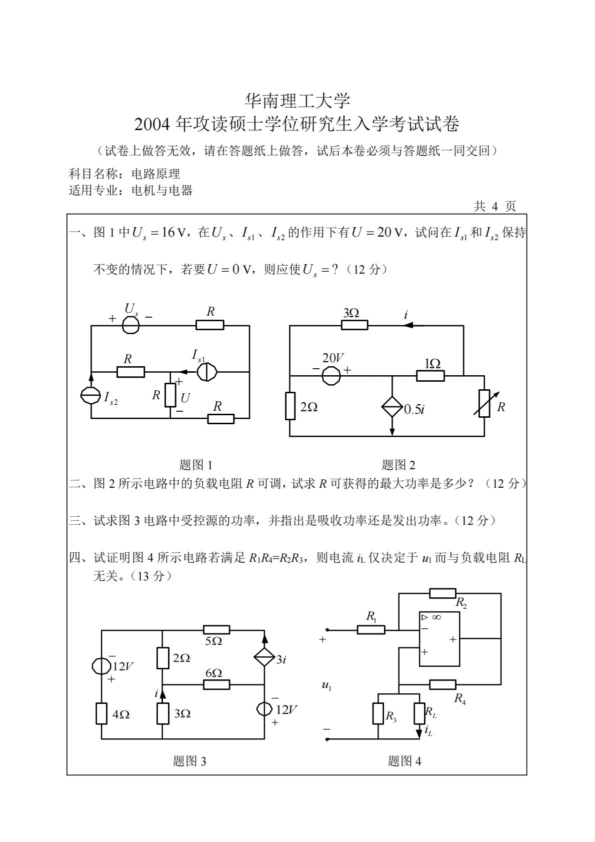 华南理工大学2004年攻读硕士学位研究生入学考试试卷(试卷上做答无效,请在答题纸上做答,试后本卷必须与答题纸一同交回)科目名称:电路原理适用专业:电机与电器共4页一、图1中16sUV,在sU、1sI、2sI的作用下有20UV,试问在1sI和2sI保持不变的情况下,若要0UV,则应使?sU(12分)sURRRR1sI2sIU3i20V0.5i12R题图1题图2二、图2所示电路中的负载电阻R可调,试求R可获得的最大功率是多少?(12分)三、试求图3电路中受控源的功率,并指出是吸收功率还是发出功率。(12分)四、试证明图4所示电路若满足R1R4=R2R3,则电流iL仅决定于...