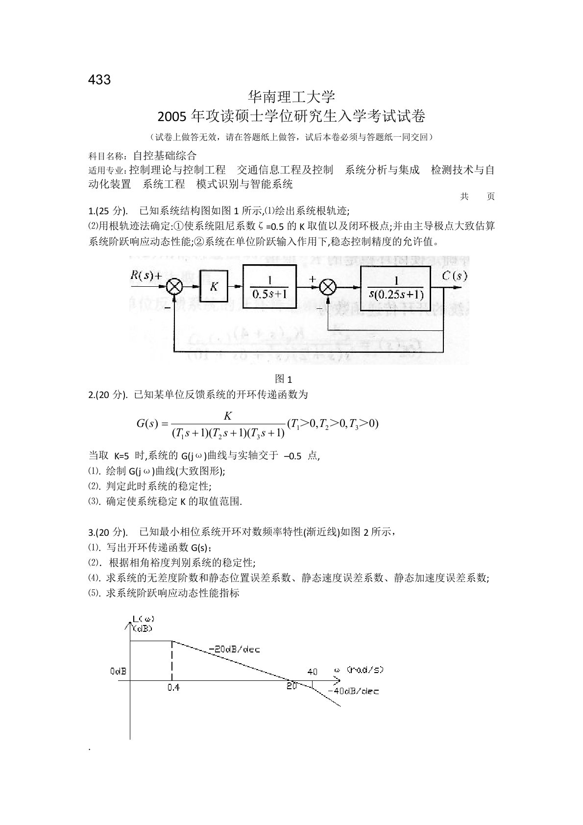 433华南理工大学2005年攻读硕士学位研究生入学考试试卷(试卷上做答无效,请在答题纸上做答,试后本卷必须与答题纸一同交回)科目名称:自控基础综合适用专业:控制理论与控制工程交通信息工程及控制系统分析与集成检测技术与自动化装置系统工程模式识别与智能系统共页1.(25分).已知系统结构图如图1所示,⑴绘出系统根轨迹;⑵用根轨迹法确定:①使系统阻尼系数ζ=0.5的K取值以及闭环极点;并由主导极点大致估算系统阶跃响应动态性能;②系统在单位阶跃输入作用下,稳态控制精度的允许值。图12.(20分).已知某单位反馈系统的开环传递函数为当取K=5时,系统的G(jω)曲线与实轴交于–0.5点,绘制G(jω)曲...