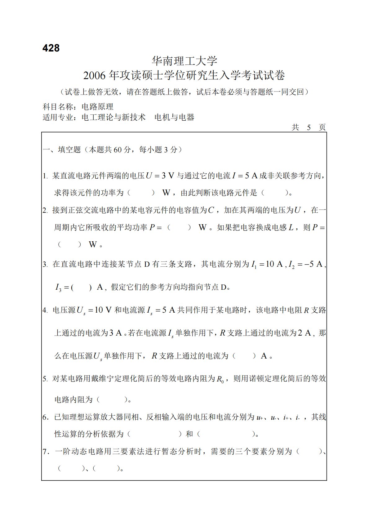 428华南理工大学2006年攻读硕士学位研究生入学考试试卷(试卷上做答无效,请在答题纸上做答,试后本卷必须与答题纸一同交回)科目名称:电路原理适用专业:电工理论与新技术电机与电器共5页一、填空题(本题共60分,每小题3分)1.某直流电路元件两端的电压3VU与通过它的电流5AI成非关联参考方向,求得该元件的功率为()W,由此判断该电路元件是()。2.接到正弦交流电路中的某电容元件的电容值为C,加在其两端的电压为U,在一周期内它所吸收的平均功率P()W。如果把电容换成电感L,则P()W。3.在直流电路中连接某节点D有三条支路,其电流分别为110AI,25AI,3I()A,假定它们的...