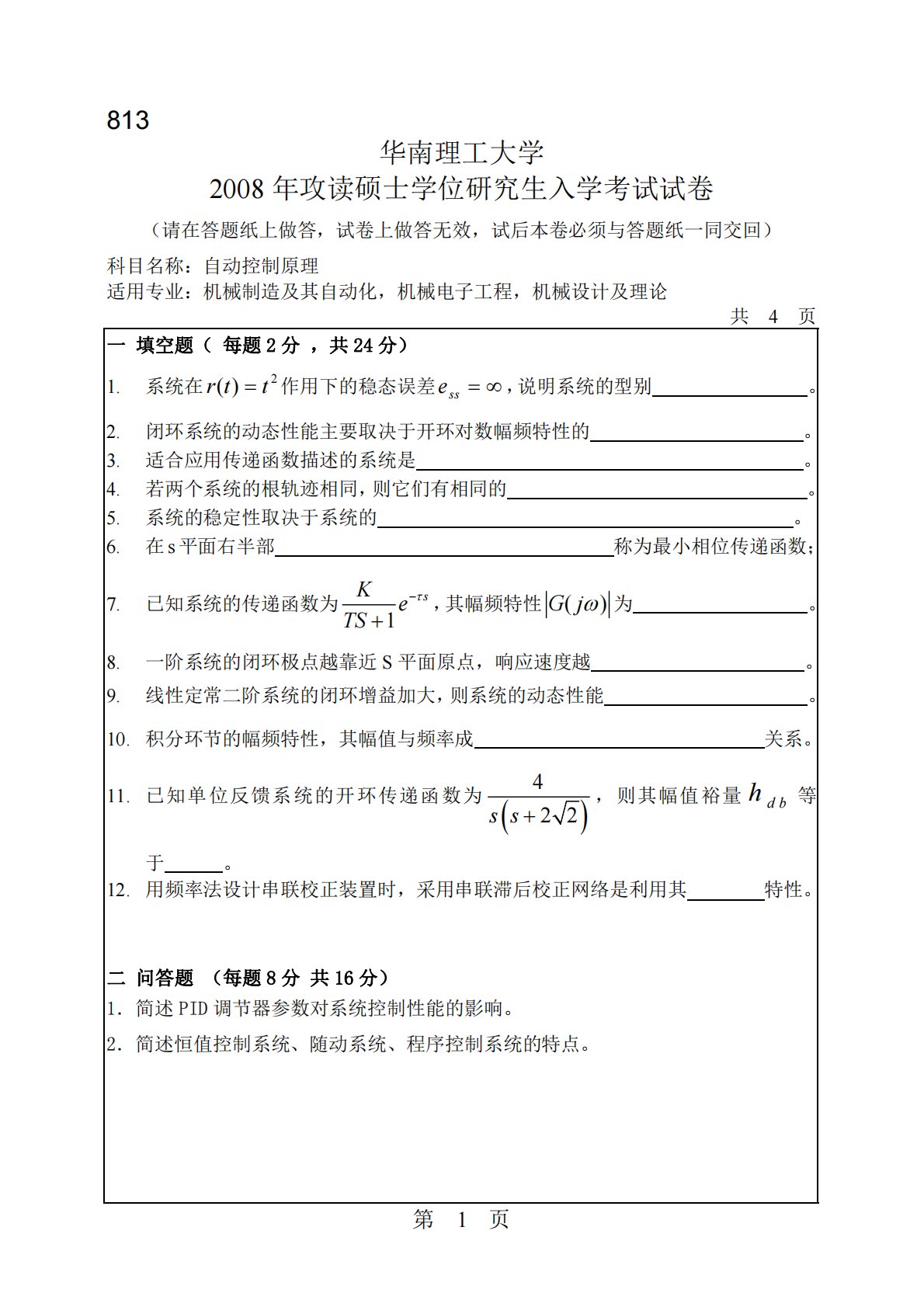 813华南理工大学2008年攻读硕士学位研究生入学考试试卷(请在答题纸上做答,试卷上做答无效,试后本卷必须与答题纸一同交回)科目名称:自动控制原理适用专业:机械制造及其自动化,机械电子工程,机械设计及理论共4页第1页一填空题(每题2分,共24分)1.系统在作用下的稳态误差2)(ttr=∞=sse,说明系统的型别。2.闭环系统的动态性能主要取决于开环对数幅频特性的。3.适合应用传递函数描述的系统是。4.若两个系统的根轨迹相同,则它们有相同的。5.系统的稳定性取决于系统的。6.在s平面右半部称为最小相位传递函数;7.已知系统的传递函数为1sKeTSτ−+,其幅频特性()Gjω为。8.一阶系统的闭环...
