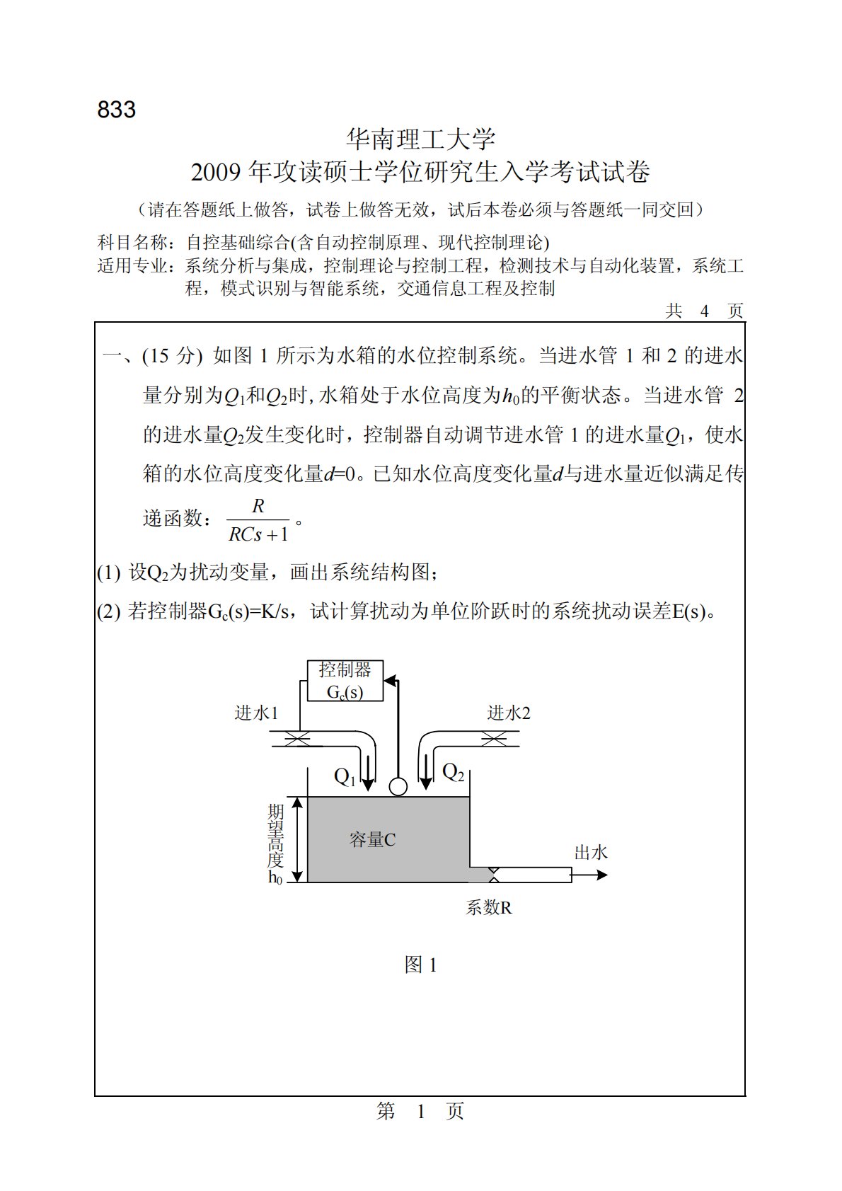 833华南理工大学2009年攻读硕士学位研究生入学考试试卷(请在答题纸上做答,试卷上做答无效,试后本卷必须与答题纸一同交回)科目名称:自控基础综合(含自动控制原理、现代控制理论)适用专业:系统分析与集成,控制理论与控制工程,检测技术与自动化装置,系统工程,模式识别与智能系统,交通信息工程及控制共4页第1页一、(15分)如图1所示为水箱的水位控制系统。当进水管1和2的进水量分别为Q1和Q2时,水箱处于水位高度为h0的平衡状态。当进水管2的进水量Q2发生变化时,控制器自动调节进水管1的进水量Q1,使水箱的水位高度变化量d=0。已知水位高度变化量d与进水量近似满足传递函数:1+RCsR。(1)设Q2...
