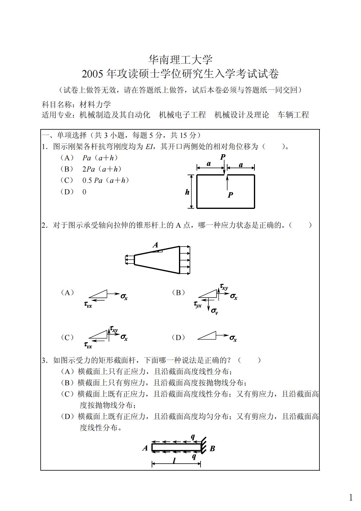 华南理工大学2005年攻读硕士学位研究生入学考试试卷(试卷上做答无效,请在答题纸上做答,试后本卷必须与答题纸一同交回)科目名称:材料力学适用专业:机械制造及其自动化机械电子工程机械设计及理论车辆工程一、单项选择(共3小题,每题5分,共15分)1.图示刚架各杆抗弯刚度均为EI,其开口两侧处的相对角位移为()。(A)Pa(a+h)(B)2Pa(a+h)(C)0.5Pa(a+h)(D)02.对于图示承受轴向拉伸的锥形杆上的A点,哪一种应力状态是正确的。()(A)(B)(C)(D)3.如图示受力的矩形截面杆,下面哪一种说法是正确的?()(A)横截面上只有正应力,且沿截面高度线性分布;(B)横截面上只有...