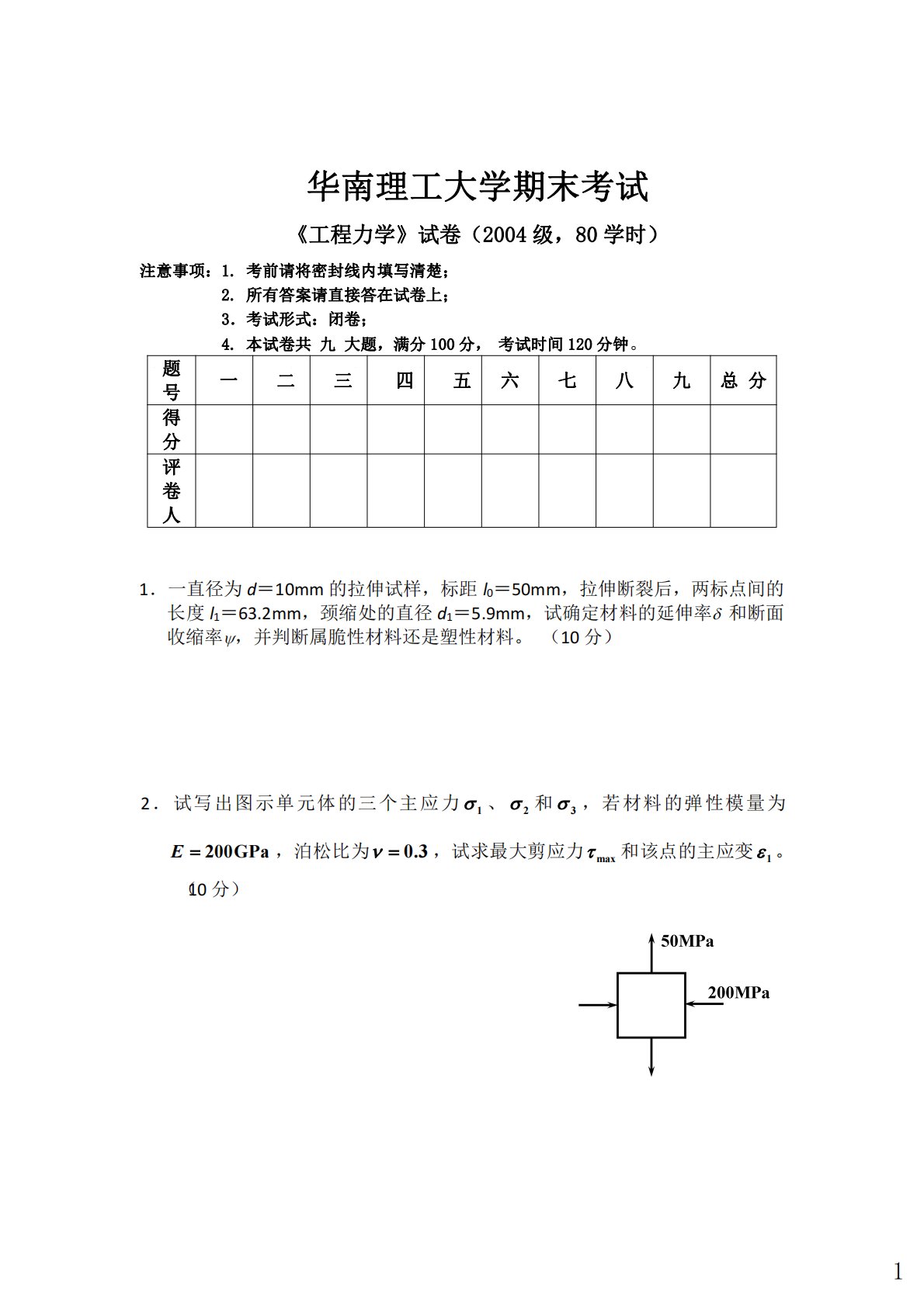 10E200GPa,泊松比为0.3,试求最大剪应力max和该点的主应变12.试写出图示单元体的三个主应力1、2和3,若材料的弹性模量为。(分)华南理工大学期末考试《工程力学》试卷(2004级,80学时)注意事项:1.考前请将密封线内填写清楚;2.所有答案请直接答在试卷上;3.考试形式:闭卷;4.本试卷共九大题,满分100分,考试时间120分钟。题号一二三四五六七八九总分得分评卷人1.一直径为d=10mm的拉伸试样,标距l0=50mm,拉伸断裂后,两标点间的长度l1=63.2mm,颈缩处的直径d1=5.9mm,试确定材料的延伸率和断面收缩率,并判断属脆性材料还是塑性材料。(1...
