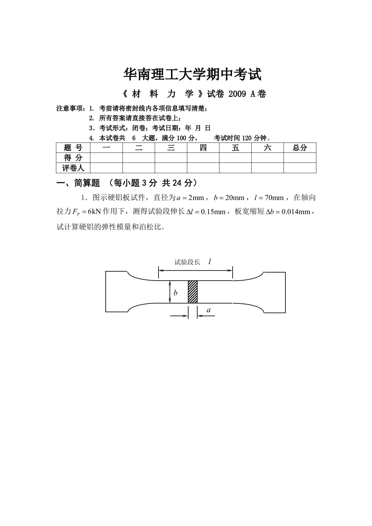 华南理工大学期中考试《材料力学》试卷2009A卷注意事项:1.考前请将密封线内各项信息填写清楚;2.所有答案请直接答在试卷上;3.考试形式:闭卷;考试日期:年月日4.本试卷共6大题,满分100分,考试时间120分钟。一、简算题(每小题3分共24分)1.图示硬铝板试件,直径为,,,在轴向拉力作用下,测得试验段伸长,板宽缩短,试计算硬铝的弹性模量和泊松比。2.图示图形中,两半圆的直径为,正方形边长为,试计算图示面积对轴的惯性据(用表示)。3.简支梁受力偶作用在处时,梁中点的挠度,试求在点作用力时截