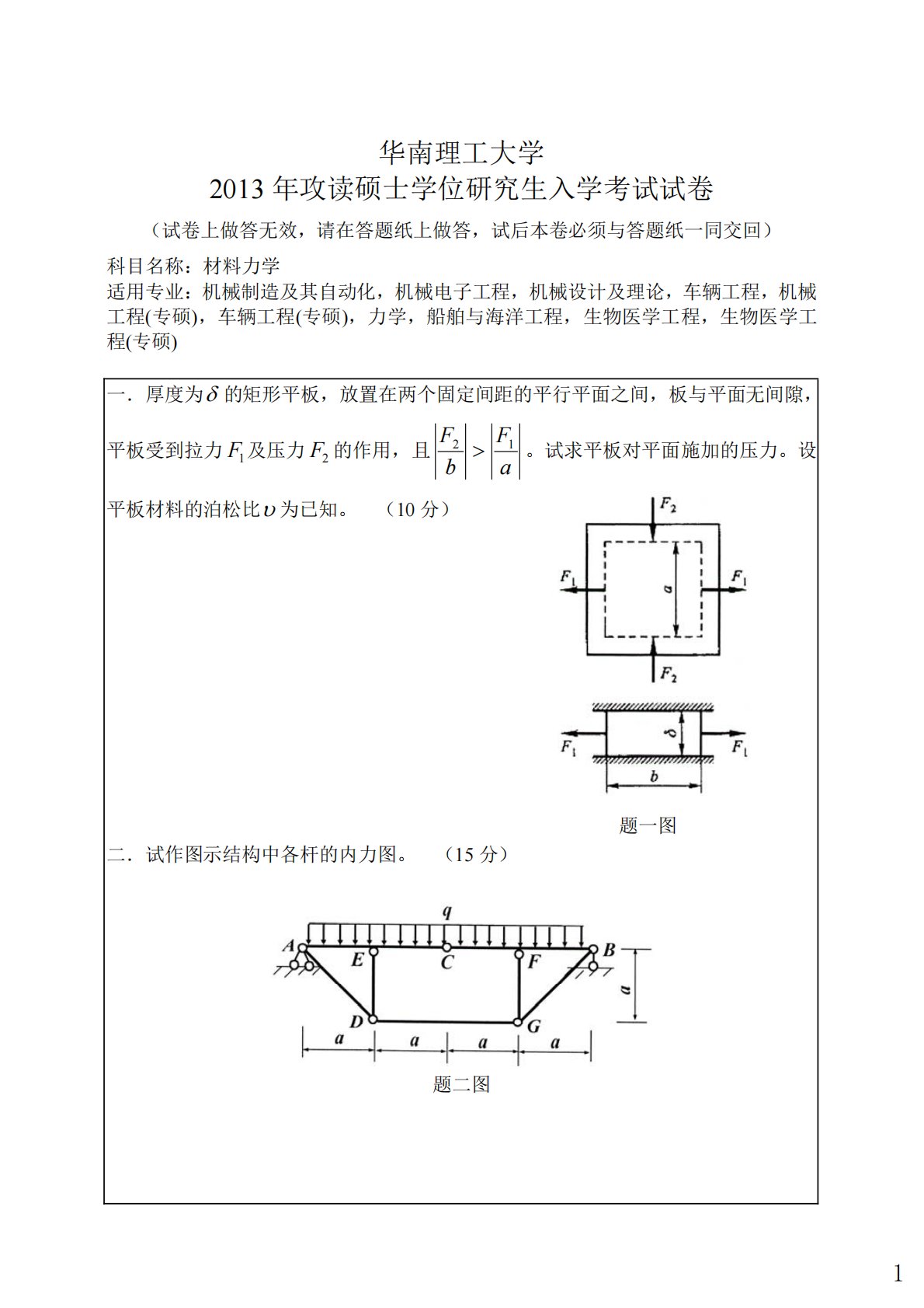 华南理工大学2013年攻读硕士学位研究生入学考试试卷(试卷上做答无效,请在答题纸上做答,试后本卷必须与答题纸一同交回)科目名称:材料力学适用专业:机械制造及其自动化,机械电子工程,机械设计及理论,车辆工程,机械工程(专硕),车辆工程(专硕),力学,船舶与海洋工程,生物医学工程,生物医学工程(专硕)一.厚度为的矩形平板,放置在两个固定间距的平行平面之间,板与平面无间隙,平板受到拉力1F及压力2F的作用,且aFbF12。试求平板对平面施加的压力。设平板材料的泊松比为已知。(10分)题一图二.试作图示结构中各杆的内力图。(15分)题二图1三.图示刚性梁BCD通过螺栓与控制杆连接于B处,与液压缸...