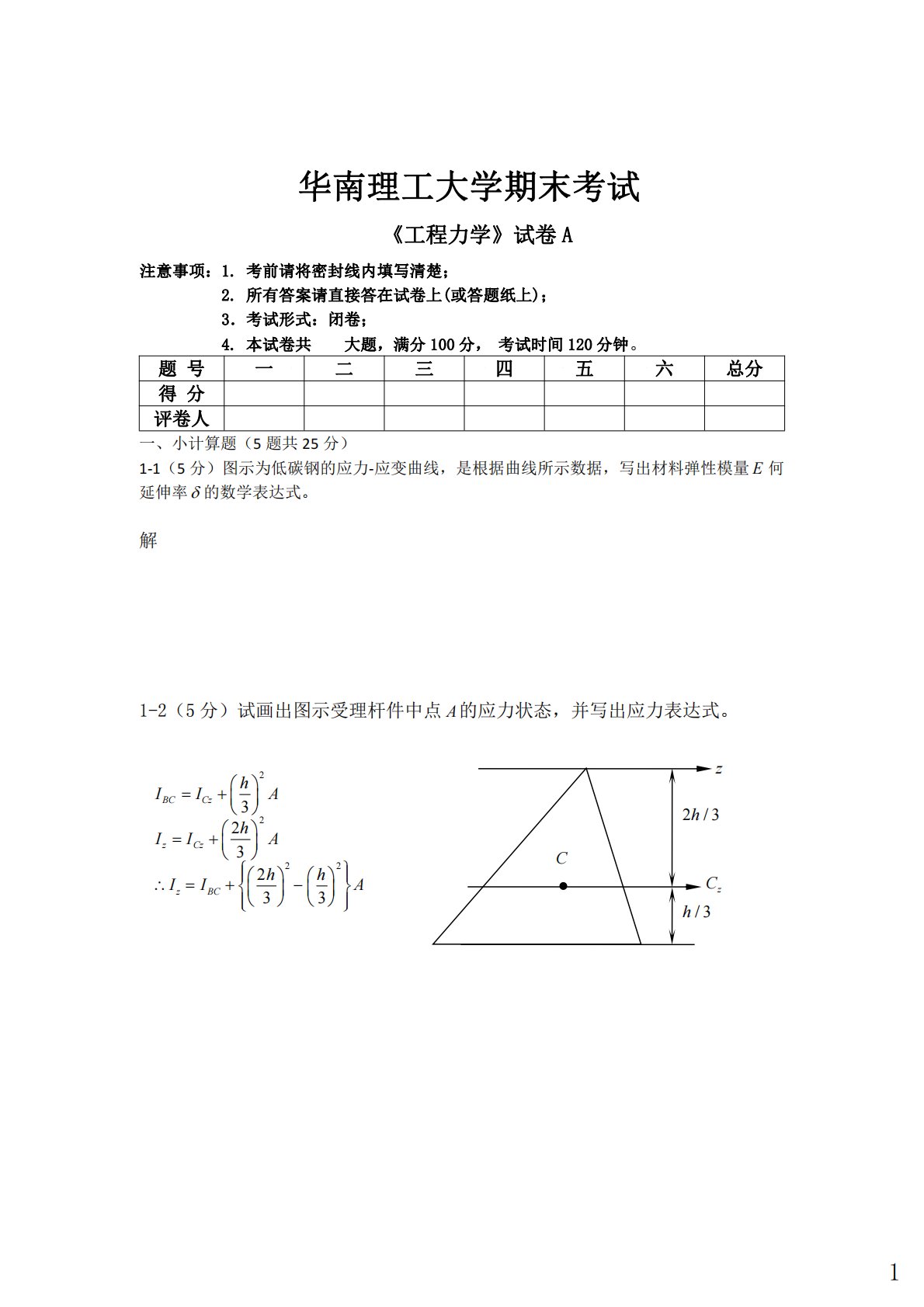 华南理工大学期末考试《工程力学》试卷A注意事项:1.考前请将密封线内填写清楚;2.所有答案请直接答在试卷上(或答题纸上);3.考试形式:闭卷;4.本试卷共大题,满分100分,考试时间120分钟。题号一二三四五六总分得分评卷人一、小计算题(5题共25分)1-1(5分)图示为低碳钢的应力-应变曲线,是根据曲线所示数据,写出材料弹性模量E何延伸率的数学表达式。解1-2(5分)试画出图示受理杆件中点A的应力状态,并写出应力表达式。zzC2/3hC/3h2222323233BCCzzCzzBChIIAhIIAhhIIA...