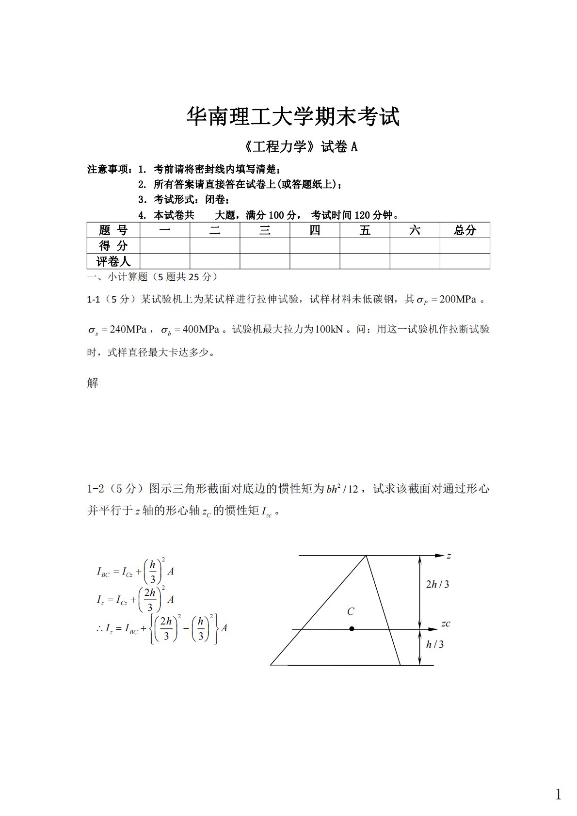 华南理工大学期末考试《工程力学》试卷A注意事项:1.考前请将密封线内填写清楚;2.所有答案请直接答在试卷上(或答题纸上);3.考试形式:闭卷;4.本试卷共大题,满分100分,考试时间120分钟。题号一二三四五六总分得分评卷人一、小计算题(5题共25分)1-1(5分)某试验机上为某试样进行拉伸试验,试样材料未低碳钢,其200MPaP。240MPas,400MPab。试验机最大拉力为100kN。问:用这一试验机作拉断试验时,式样直径最大卡达多少。解1-2(5分)图示三角形截面对底边的惯性矩为2/12bh,试求该截面对通过形心并平行于z轴的形心轴Cz的惯性矩zcI。zzc2/3hC/3h...