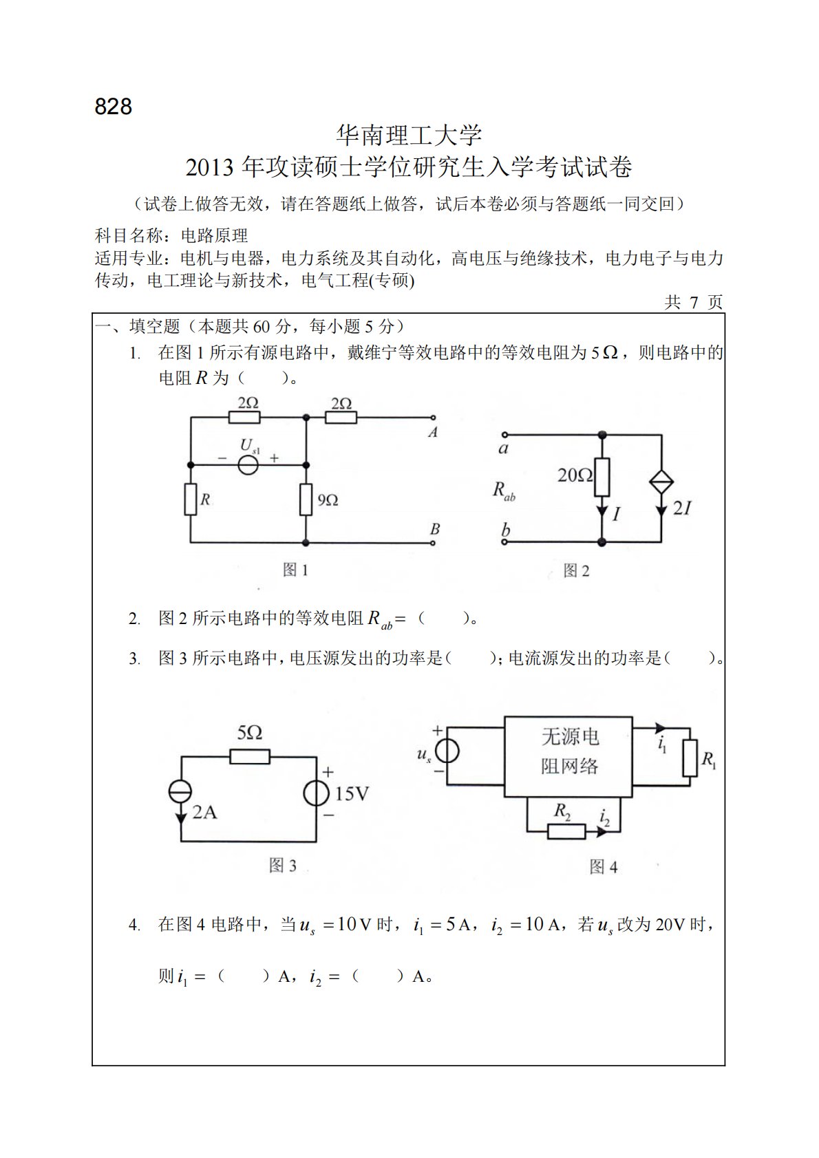 828华南理工大学2013年攻读硕士学位研究生入学考试试卷(试卷上做答无效,请在答题纸上做答,试后本卷必须与答题纸一同交回)科目名称:电路原理适用专业:电机与电器,电力系统及其自动化,高电压与绝缘技术,电力电子与电力传动,电工理论与新技术,电气工程(专硕)共7页一、填空题(本题共60分,每小题5分)1.在图1所示有源电路中,戴维宁等效电路中的等效电阻为5,则电路中的电阻R为()。2.图2所示电路中的等效电阻abR()。3.图3所示电路中,电压源发出的功率是();电流源发出的功率是()。4.在图4电路中,当10suV时,51iA,102iA,若su改为20V时,则1i()A,2i(...
