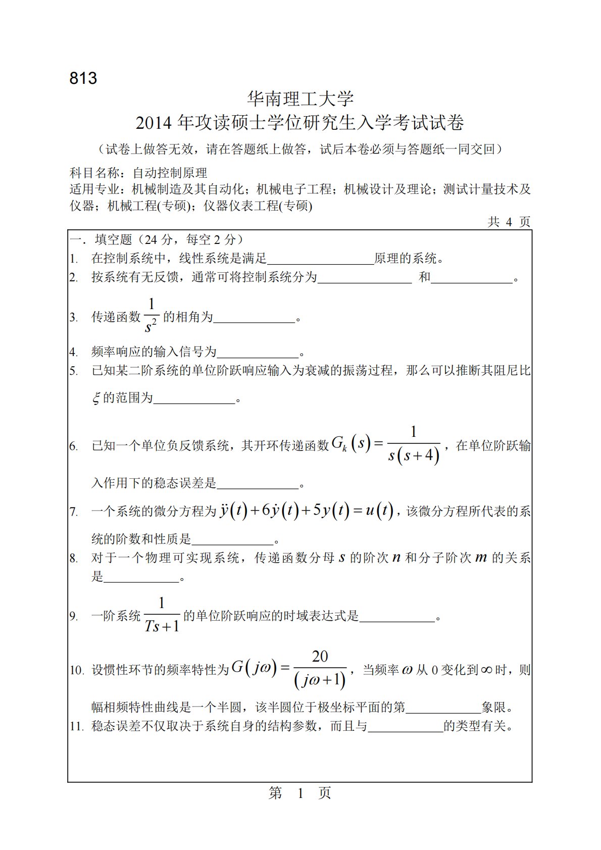 813华南理工大学2014年攻读硕士学位研究生入学考试试卷(试卷上做答无效,请在答题纸上做答,试后本卷必须与答题纸一同交回)科目名称:自动控制原理适用专业:机械制造及其自动化;机械电子工程;机械设计及理论;测试计量技术及仪器;机械工程(专硕);仪器仪表工程(专硕)共4页第1页一.填空题(24分,每空2分)1.在控制系统中,线性系统是满足原理的系统。2.按系统有无反馈,通常可将控制系统分为和。3.传递函数21s的相角为。4.频率响应的输入信号为。5.已知某二阶系统的单位阶跃响应输入为衰减的振荡过程,那么可以推断其阻尼比的范围为。6.已知一个单位负反馈系统,其开环传递函数14kGsss...