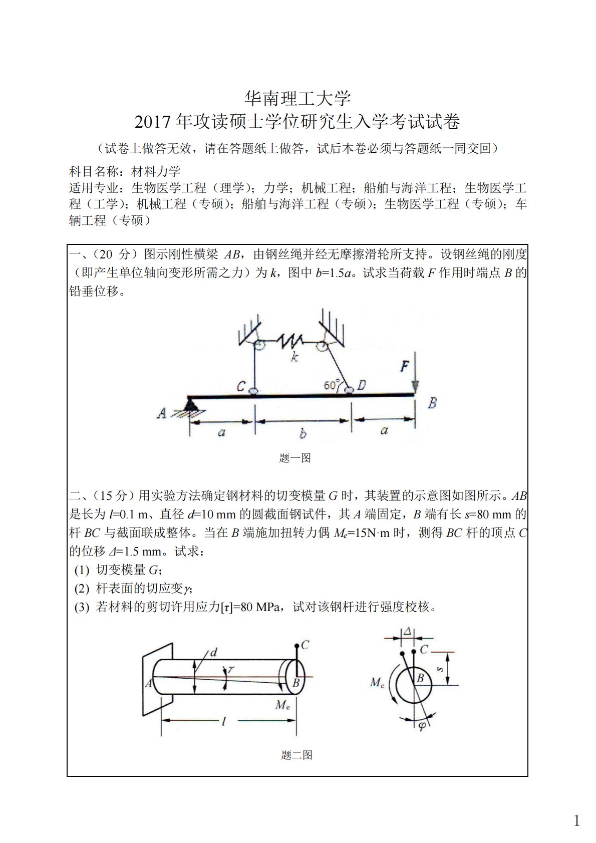 华南理工大学2017年攻读硕士学位研究生入学考试试卷(试卷上做答无效,请在答题纸上做答,试后本卷必须与答题纸一同交回)科目名称:材料力学适用专业:生物医学工程(理学);力学;机械工程;船舶与海洋工程;生物医学工程(工学);机械工程(专硕);船舶与海洋工程(专硕);生物医学工程(专硕);车辆工程(专硕)一、(20分)图示刚性横梁AB,由钢丝绳并经无摩擦滑轮所支持。设钢丝绳的刚度(即产生单位轴向变形所需之力)为k,图中b=1.5a。试求当荷载F作用时端点B的铅垂位移。题一图二、(15分)用实验方法确定钢材料的切变模量G时,其装置的示意图如图所示。AB是长为l=0.1m、直径d=10mm的圆截面钢试...