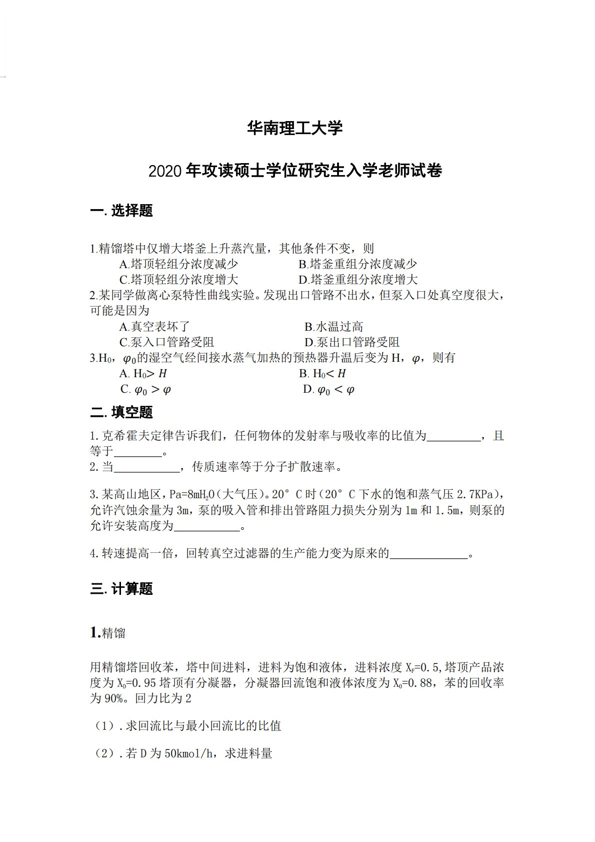一.选择华南理工大学2020年攻读硕士学位研究生入学老师试卷题1.精馏塔中仅增大塔釜上升蒸汽量,其他条件不变,则A.塔顶轻组分浓度减少B.塔釜重组分浓度减少C.塔顶轻组分浓度增大D.塔釜重组分浓度增大2.某同学做离心泵特性曲线实验。发现出口管路不出水,但泵入口处真空度很大,可能是因为A.真空表坏了B.水温过高C.泵入口管路受阻D.泵出口管路受阻3.H0,的湿空气经间接水蒸气加热的预热器升温后变为H,,则有A.H0B.H0C.D.二.填空题1.克希霍夫定律告诉我们,任何物体的发射率与吸收率的比值为,且等于。2.当,传质速率等于分子扩散速率。3.某高山地区,Pa=8mH2O(大气压)。20°C时(...