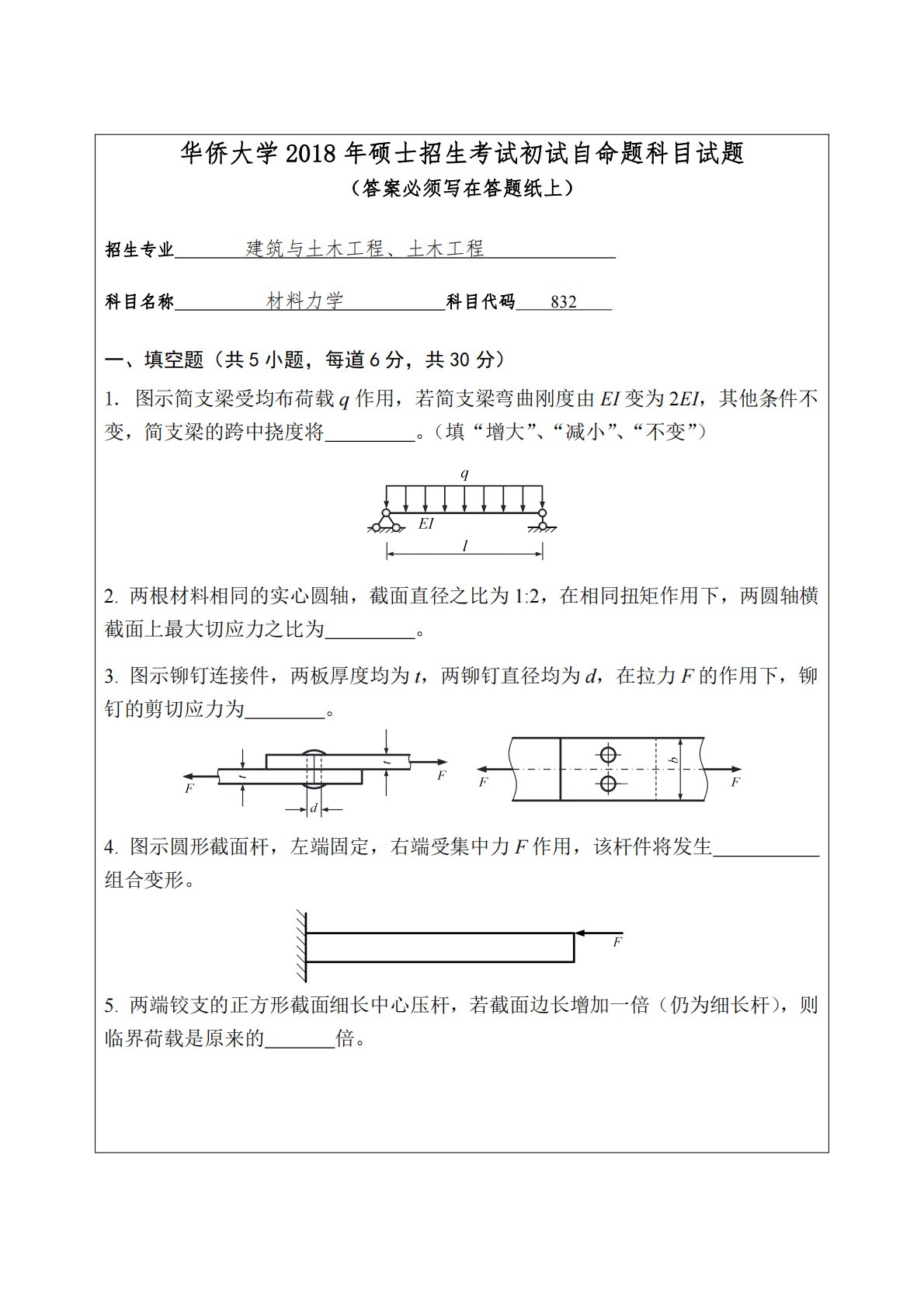 华侨大学2018年硕士招生考试初试自命题科目试题(答案必须写在答题纸上)招生专业建筑与土木工程、土木工程科目名称材料力学科目代码832一、填空题(共5小题,每道6分,共30分)1.图示简支梁受均布荷载q作用,若简支梁弯曲刚度由EI变为2EI,其他条件不变,简支梁的跨中挠度将。(填“增大”、“减小”、“不变”)2.两根材料相同的实心圆轴,截面直径之比为1:2,在相同扭矩作用下,两圆轴横截面上最大切应力之比为。3.图示铆钉连接件,两板厚度均为t,两铆钉直径均为d,在拉力F的作用下,铆钉的剪切应力为。4.图示圆形截面杆,左端固定,右端受集中力F作用,该杆件将发生组合变形。5.两端铰支的正方形截面细长...