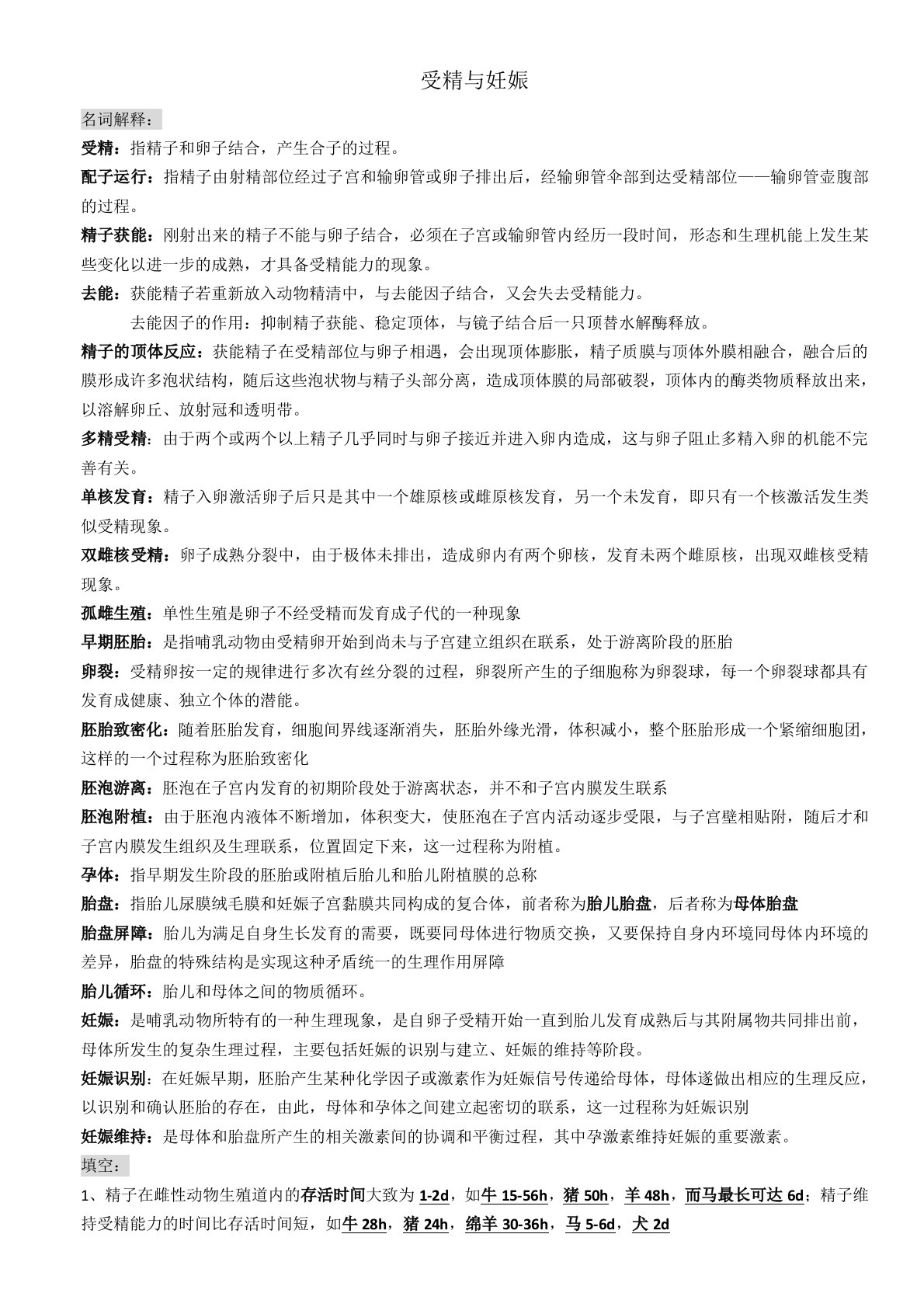 受精与妊娠名词解释:受精:指精子和卵子结合,产生合子的过程。配子运行:指精子由射精部位经过子宫和输卵管或卵子排出后,经输卵管伞部到达受精部位——输卵管壶腹部的过程。精子获能:刚射出来的精子不能与卵子结合,必须在子宫或输卵管内经历一段时间,形态和生理机能上发生某些变化以进一步的成熟,才具备受精能力的现象。去能:获能精子若重新放入动物精清中,与去能因子结合,又会失去受精能力。去能因子的作用:抑制精子获能、稳定顶体,与镜子结合后一只顶替水解酶释放。精子的顶体反应:获能精子在受精部位与卵子相遇,会出现顶体膨胀,精子质膜与顶体外膜相融合,融合后的膜形成许多泡状结构,随后这些泡状物与精子头部分离,造成顶体...