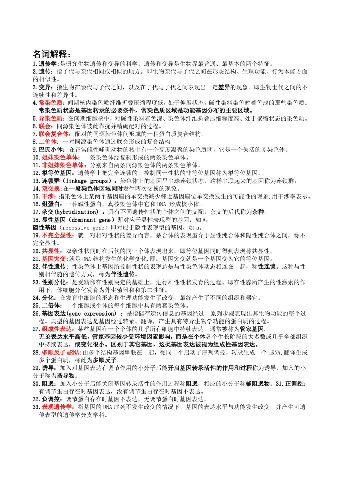 名词解释:1.遗传学:是研究生物遗传和变异的科学。遗传和变异是生物界最普通、最基本的两个特征。2.遗传:指子代与亲代相同或相似的地方。即生物亲代与子代之间在形态结构、生理功能、行为本能方面的相似性。3.变异:指生物在亲代与子代之间,以及在子代与子代之间表现出一定差异的现象。即生物世代之间的不连续性和差异性。4.常染色质:间期核内染色质纤维折叠压缩程度低,处于伸展状态,碱性染料染色时着色浅的那些染色质。常染色质状态是基因转录的必要条件,常染色质区域是功能基因分布的主要区域。5.异染色质:在间期细胞核中,对碱性染料着色深、染色体纤维折叠压缩程度高、处于聚缩状态的染色质。6.联会:同源染色体彼此靠拢...