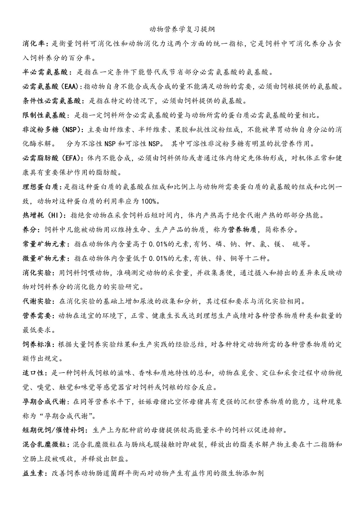 动物营养学复习提纲消化率:是衡量饲料可消化性和动物消化力这两个方面的统一指标,它是饲料中可消化养分占食入饲料养分的百分率。半必需氨基酸:是指在一定条件下能替代或节省部分必需氨基酸的氨基酸。必需氨基酸(EAA):指动物自身不能合成或合成的量不能满足动物的需要,必须由饲粮提供的氨基酸。条件性必需氨基酸:是指在特定的情况下,必须由饲料提供的氨基酸。限制性氨基酸:是指一定饲料所含必需氨基酸的量与动物所需的蛋白质必需氨基酸的量相比。非淀粉多糖(NSP):主要由纤维素、半纤维素、果胶和抗性淀粉组成,不能被单胃动物自身分泌的消化酶水解。分为不溶性NSP和可溶性NSP。其中可溶性非淀粉多糖有明显的抗营养作用。...
