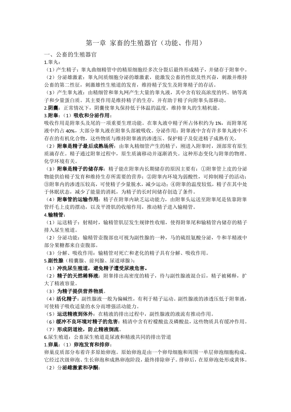第一章家畜的生殖器官(功能、作用)一、公畜的生殖器官1.睾丸:(1)产生精子:睾丸曲细精管中的精原细胞经多次分裂后最终形成精子,并储存于附睾中。(2)分泌雄激素:睾丸间质细胞分泌的雄激素,能激发公畜的性欲及性兴奋,刺激并维持公畜的第二性征,刺激雄性生殖道的发育,维持精子发生及附睾精子的存活。(3)产生睾丸液:由精细管和睾丸网产生大量的睾丸液,其中含有较高浓度的钙、钠等离子和少量蛋白质。其主要作用是维持精子的生存,并有助于精子向附睾头部移动。2.阴囊:正常情况下,阴囊使睾丸保持低于体温的温度,维持睾丸的生精机能。3.附睾:(1)吸收和分泌作用:吸收作用是附睾头及尾的一项重要生理功能。在睾丸液中精...
