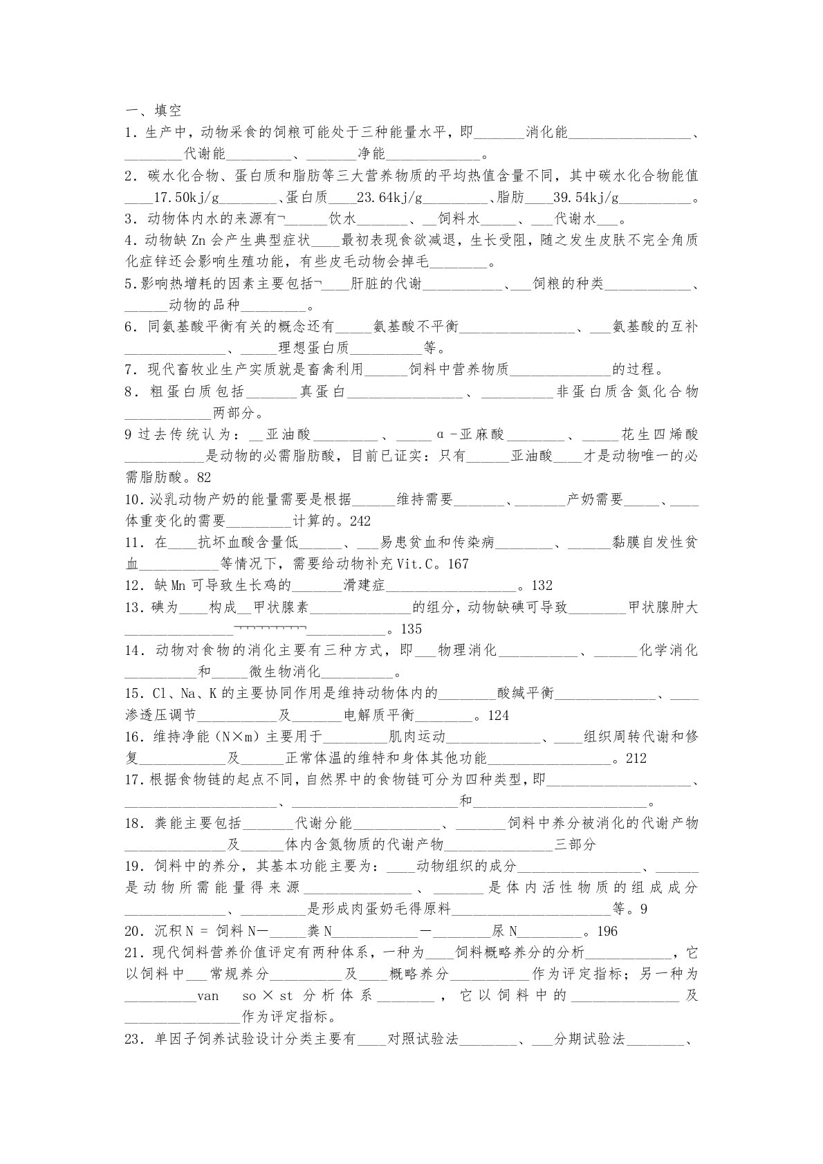 一、填空1.生产中,动物采食的饲粮可能处于三种能量水平,即_______消化能_________________、________代谢能_________、_______净能_____________。2.碳水化合物、蛋白质和脂肪等三大营养物质的平均热值含量不同,其中碳水化合物能值____17.50kj/g________、蛋白质____23.64kj/g_________、脂肪____39.54kj/g__________。3.动物体内水的来源有¬______饮水_______、__饲料水_____、___代谢水___。4.动物缺Zn会产生典型症状____最初表现食欲减退,生长受阻,随之发生...