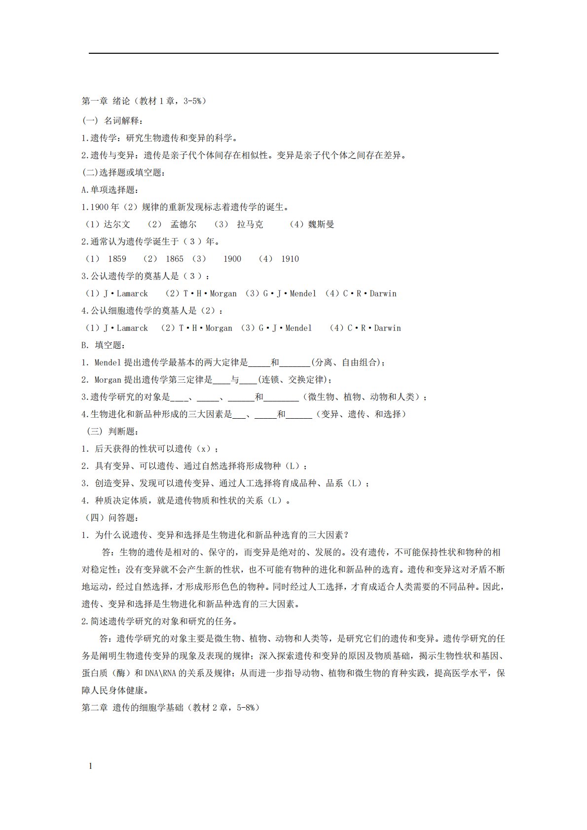 1第一章绪论(教材1章,3-5%)(一)名词解释:1.遗传学:研究生物遗传和变异的科学。2.遗传与变异:遗传是亲子代个体间存在相似性。变异是亲子代个体之间存在差异。(二)选择题或填空题:A.单项选择题:1.1900年(2)规律的重新发现标志着遗传学的诞生。(1)达尔文(2)孟德尔(3)拉马克(4)魏斯曼2.通常认为遗传学诞生于(3)年。(1)1859(2)1865(3)1900(4)19103.公认遗传学的奠基人是(3):(1)J·Lamarck(2)T·H·Morgan(3)G·J·Mendel(4)C·R·Darwin4.公认细胞遗传学的奠基人是(2):(1)J·Lamarck(2)T·H...