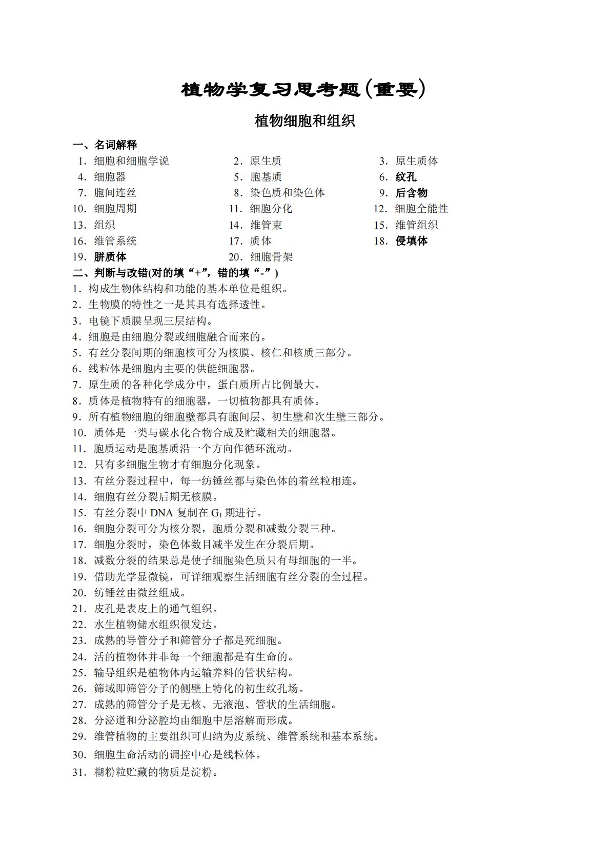 植物学复习思考题(重要)植物细胞和组织一、名词解释1.细胞和细胞学说2.原生质3.原生质体4.细胞器5.胞基质6.纹孔7.胞间连丝8.染色质和染色体9.后含物10.细胞周期11.细胞分化12.细胞全能性13.组织14.维管束15.维管组织16.维管系统17.质体18.侵填体19.胼质体20.细胞骨架二、判断与改错(对的填“+”,错的填“-”)1.构成生物体结构和功能的基本单位是组织。2.生物膜的特性之一是其具有选择透性。3.电镜下质膜呈现三层结构。4.细胞是由细胞分裂或细胞融合而来的。5.有丝分裂间期的细胞核可分为核膜、核仁和核质三部分。6.线粒体是细胞内主要的供能细胞器。7.原生质的各种化学...