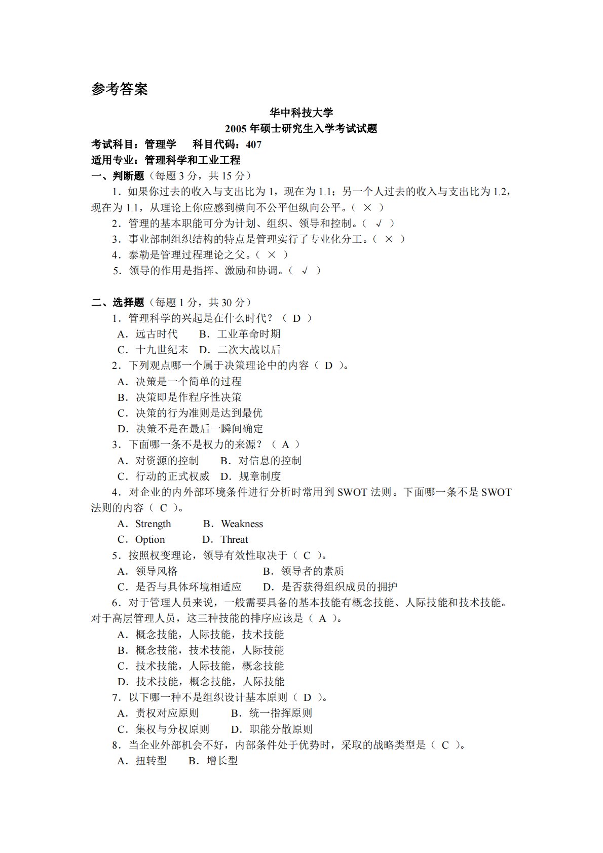 参考答案华中科技大学2005年硕士研究生入学考试试题考试科目:管理学科目代码:407适用专业:管理科学和工业工程一、判断题(每题3分,共15分)1.如果你过去的收入与支出比为1,现在为1.1;另一个人过去的收入与支出比为1.2,现在为1.1,从理论上你应感到横向不公平但纵向公平。(×)2.管理的基本职能可分为计划、组织、领导和控制。(√)3.事业部制组织结构的特点是管理实行了专业化分工。(×)4.泰勒是管理过程理论之父。(×)5.领导的作用是指挥、激励和协调。(√)二、选择题(每题1分,共30分)1.管理科学的兴起是在什么时代?(D)A.远古时代B.工业革命时期C.十九世纪末D.二次大战以后2...