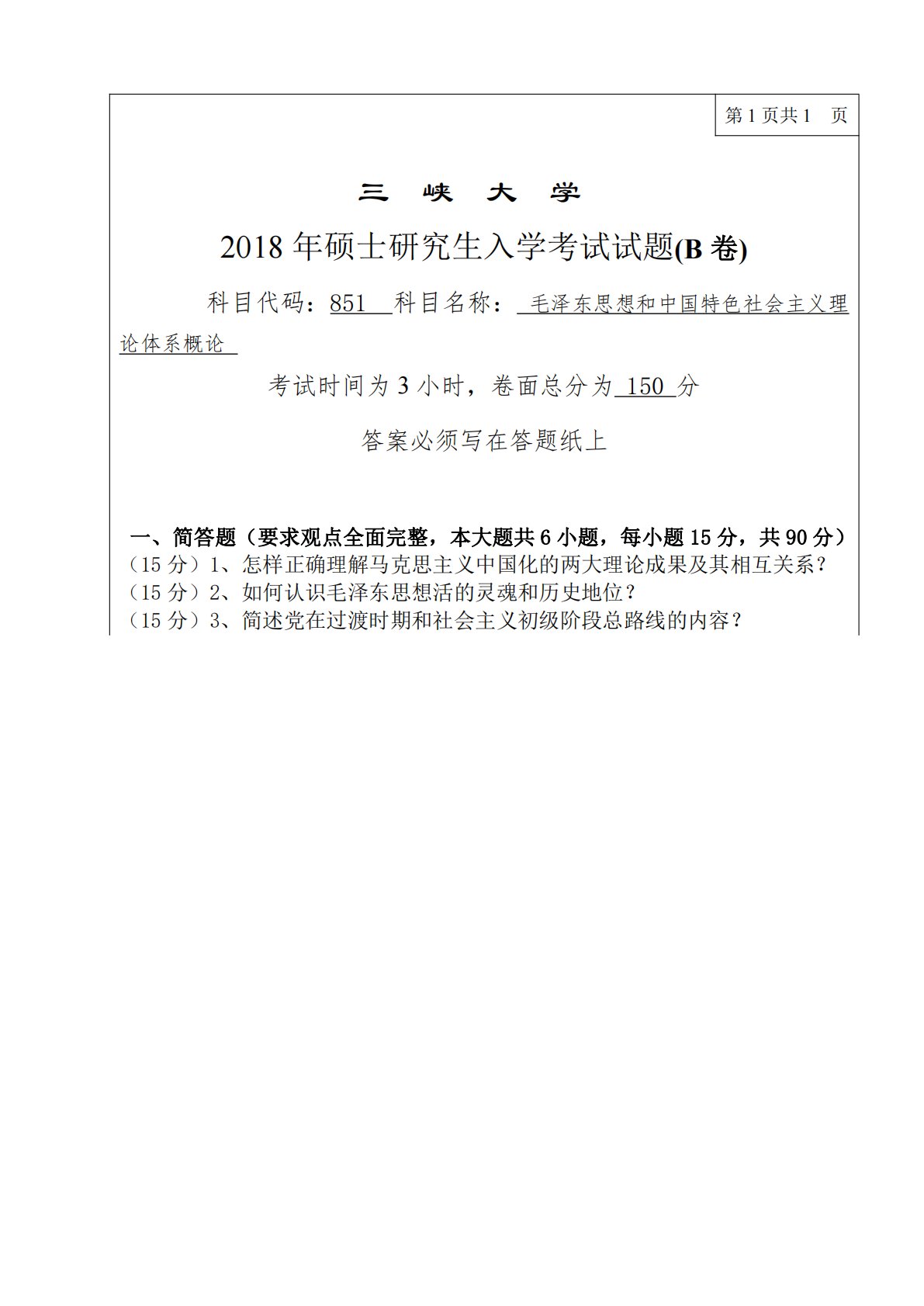 第1页共1页三峡大学2018年硕士研究生入学考试试题(B卷)科目代码:851科目名称:毛泽东思想和中国特色社会主义理论体系概论考试时间为3小时,卷面总分为150分答案必须写在答题纸上一、简答题(要求观点全面完整,本大题共6小题,每小题15分,共90分)(15分)1、怎样正确理解马克思主义中国化的两大理论成果及其相互关系?(15分)2、如何认识毛泽东思想活的灵魂和历史地位?(15分)3、简述党在过渡时期和社会主义初级阶段总路线的内容?第1页共1页三峡大学2018年硕士研究生入学考试试题(B卷)科目代码:851科目名称:毛泽东思想和中国特色社会主义理论体系概论考试时间为3小时,卷面总分为150分答...
