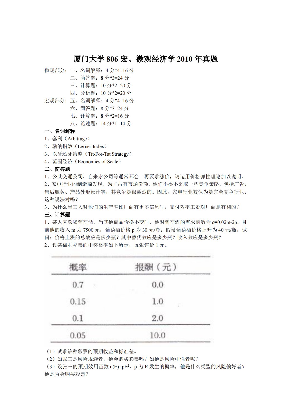(1)试求该种彩票的预期收益和标准差。(2)如张三是风险规避者,他会购买彩票吗?如他是风险中性者呢?(3)设张三的预期效用函数u(E)=pE2,p为E发生的概率,他是什么类型的风险偏好者?他是否会购买彩票?六、简答题:8分*3=24分七、计算题:8分*2=16分八、论述题:14分*1=14分一、名词解释1、套利(Arbitrage)2、勒纳指数(LernerIndex)3、以牙还牙策略(Tit-For-TatStrategy)4、范围经济(EconomiesofScale)二、简答题1、公共交通公司、自来水公司等通常都会一再要求涨价,请运用价格弹性理论加以说明。2、家电行业的制造商发现,为了占...