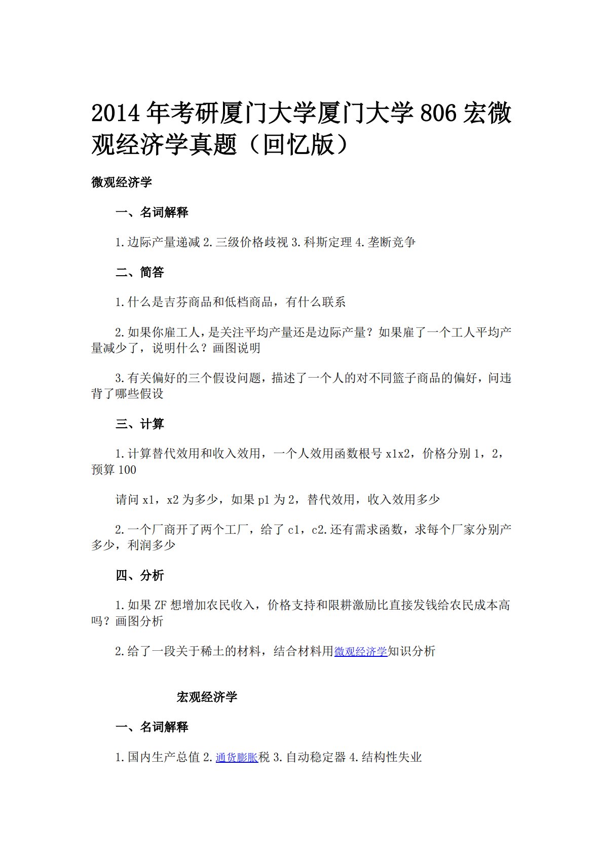 一、名词解释1.国内生产总值2.通货膨胀税3.自动稳定器4.结构性失业宏观经济学2.给了一段关于稀土的材料,结合材料用微观经济学知识分析四、分析1.如果ZF想增加农民收入,价格支持和限耕激励比直接发钱给农民成本高吗?画图分析请问x1,x2为多少,如果p1为2,替代效用,收入效用多少2.一个厂商开了两个工厂,给了c1,c2.还有需求函数,求每个厂家分别产多少,利润多少三、计算1.计算替代效用和收入效用,一个人效用函数根号x1x2,价格分别1,2,预算1003.有关偏好的三个假设问题,描述了一个人的对不同篮子商品的偏好,问违背了哪些假设2.如果你雇工人,是关注平均产量还是边际产量?如果雇了一个工人...