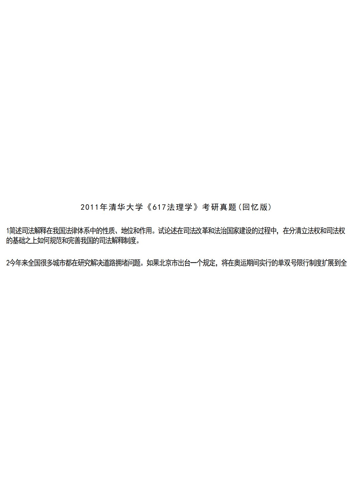 2011年清华大学《617法理学》考研真题(回忆版)1简述司法解释在我国法律体系中的性质、地位和作用。试论述在司法改革和法治国家建设的过程中,在分清立法权和司法权的基础之上如何规范和完善我国的司法解释制度。2今年来全国很多城市都在研究解决道路拥堵问题。如果北京市出台一个规定,将在奥运期间实行的单双号限行制度扩展到全2011年清华大学《617法理学》考研真题(回忆版)1简述司法解释在我国法律体系中的性质、地位和作用。试论述在司法改革和法治国家建设的过程中,在分清立法权和司法权的基础之上如何规范和完善我国的司法解释制度。2今年来全国很多城市都在研究解决道路拥堵问题。如果北京市出台一个规定,将在奥运...