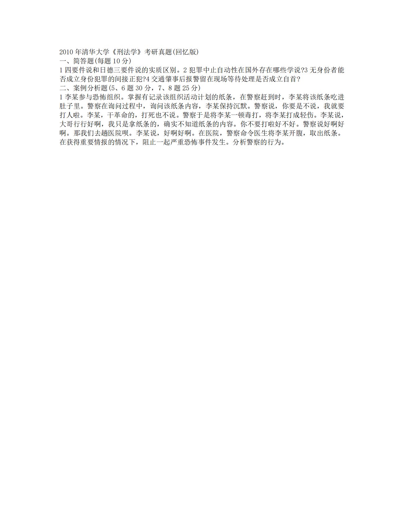 2010年清华大学《刑法学》考研真题(回忆版)一、简答题(每题10分)1四要件说和日德三要件说的实质区别。2犯罪中止自动性在国外存在哪些学说?3无身份者能否成立身份犯罪的间接正犯?4交通肇事后报警留在现场等待处理是否成立自首?二、案例分析题(5、6题30分,7、8题25分)1李某参与恐怖组织。掌握有记录该组织活动计划的纸条,在警察赶到时,李某将该纸条吃进肚子里。警察在询问过程中,询问该纸条内容,李某保持沉默。警察说,你要是不说,我就要打人啦。李某,干革命的,打死也不说。警察于是将李某一顿毒打,将李某打成轻伤。李某说,大哥行行好啊,我只是拿纸条的,确实不知道纸条的内容。你不要打啦好不好。警察说好...