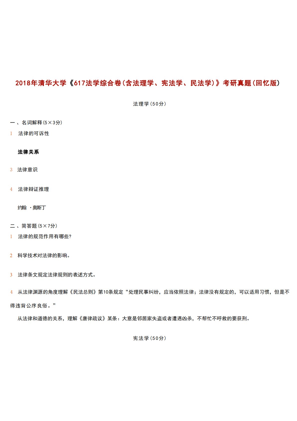 2018年清华大学《617法学综合卷(含法理学、宪法学、民法学)》考研真题(回忆版)法理学(50分)一、名词解释(5×3分)1法律的可诉性法律关系3法律意识4法律辩证推理约翰·奥斯丁二、简答题(5×7分)1法律的规范作用有哪些?2科学技术对法律的影响。3法律条文规定法律规则的表述方式。4从法律渊源的角度理解《民法总则》第10条规定“处理民事纠纷,应当依照法律;法律没有规定的,可以适用习惯,但是不得违背公序良俗。”从法律和道德的关系,理解《唐律疏议》某条:大意是邻居家失盗或者遭遇凶杀,不帮忙不呼救的要获刑。宪法学(50分)一、简答题(3×10分)1共和制是什么,有哪些主要类型?2最重要的宪法保障...