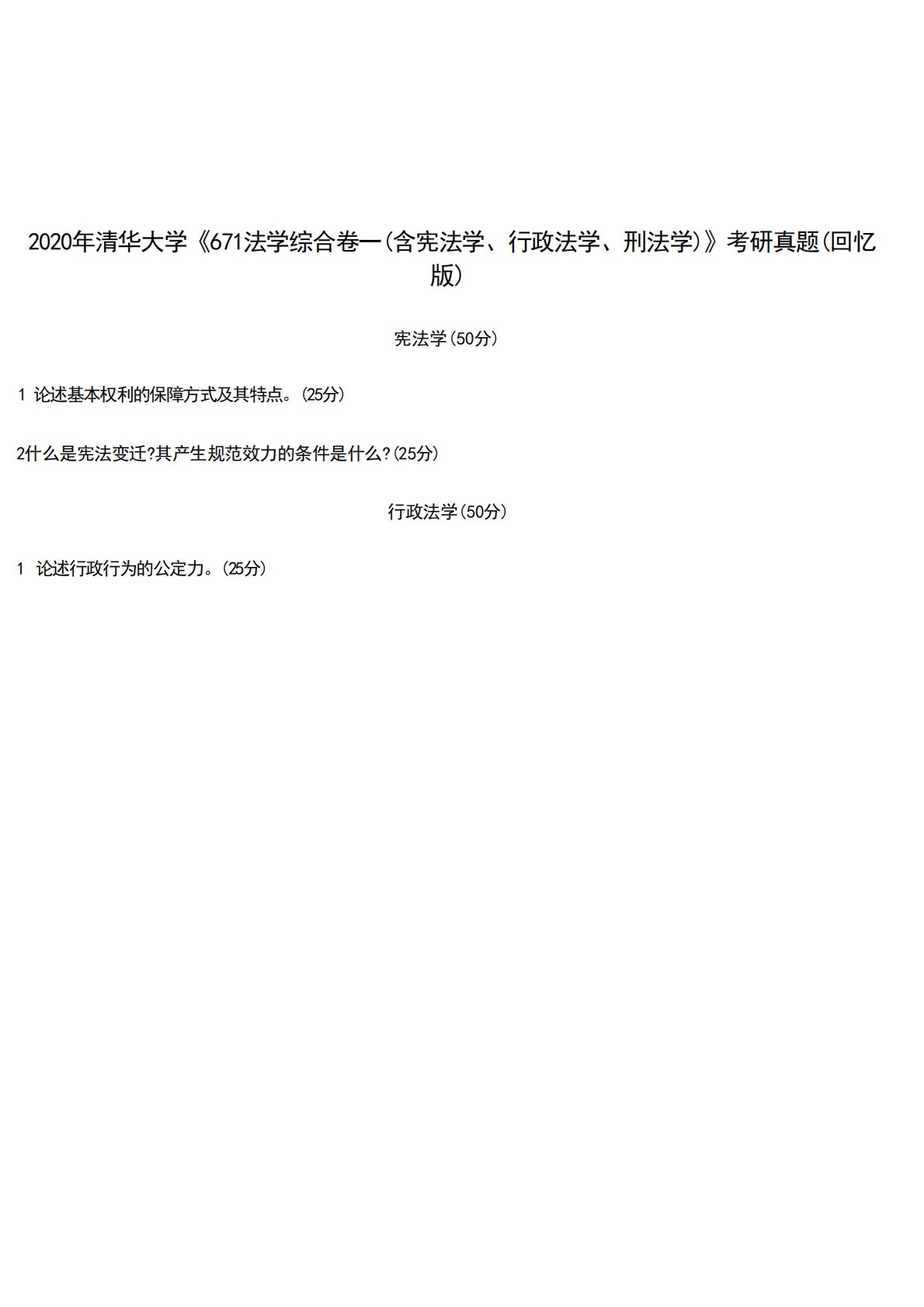 2020年清华大学《671法学综合卷一(含宪法学、行政法学、刑法学)》考研真题(回忆版)宪法学(50分)1论述基本权利的保障方式及其特点。(25分)2什么是宪法变迁?其产生规范效力的条件是什么?(25分)行政法学(50分)1论述行政行为的公定力。(25分)2020年清华大学《671法学综合卷一(含宪法学、行政法学、刑法学)》考研真题(回忆版)宪法学(50分)1论述基本权利的保障方式及其特点。(25分)2什么是宪法变迁?其产生规范效力的条件是什么?(25分)行政法学(50分)1论述行政行为的公定力。(25分)2论述《政府信息公开条例》中不予公开的情形。(25分)刑法学(50分)1论述不作为犯义务...