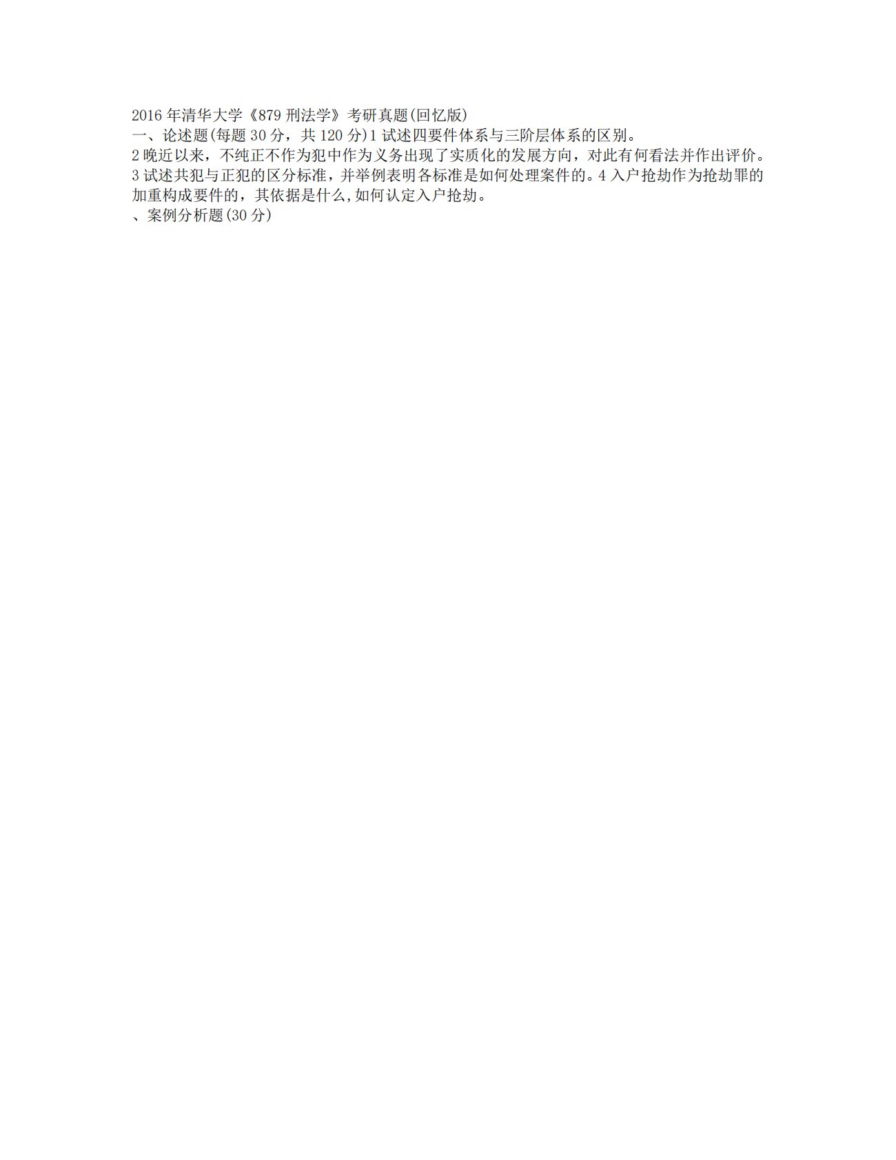 清华大学977专业综合卷二刑法学2016年真题(回忆版)