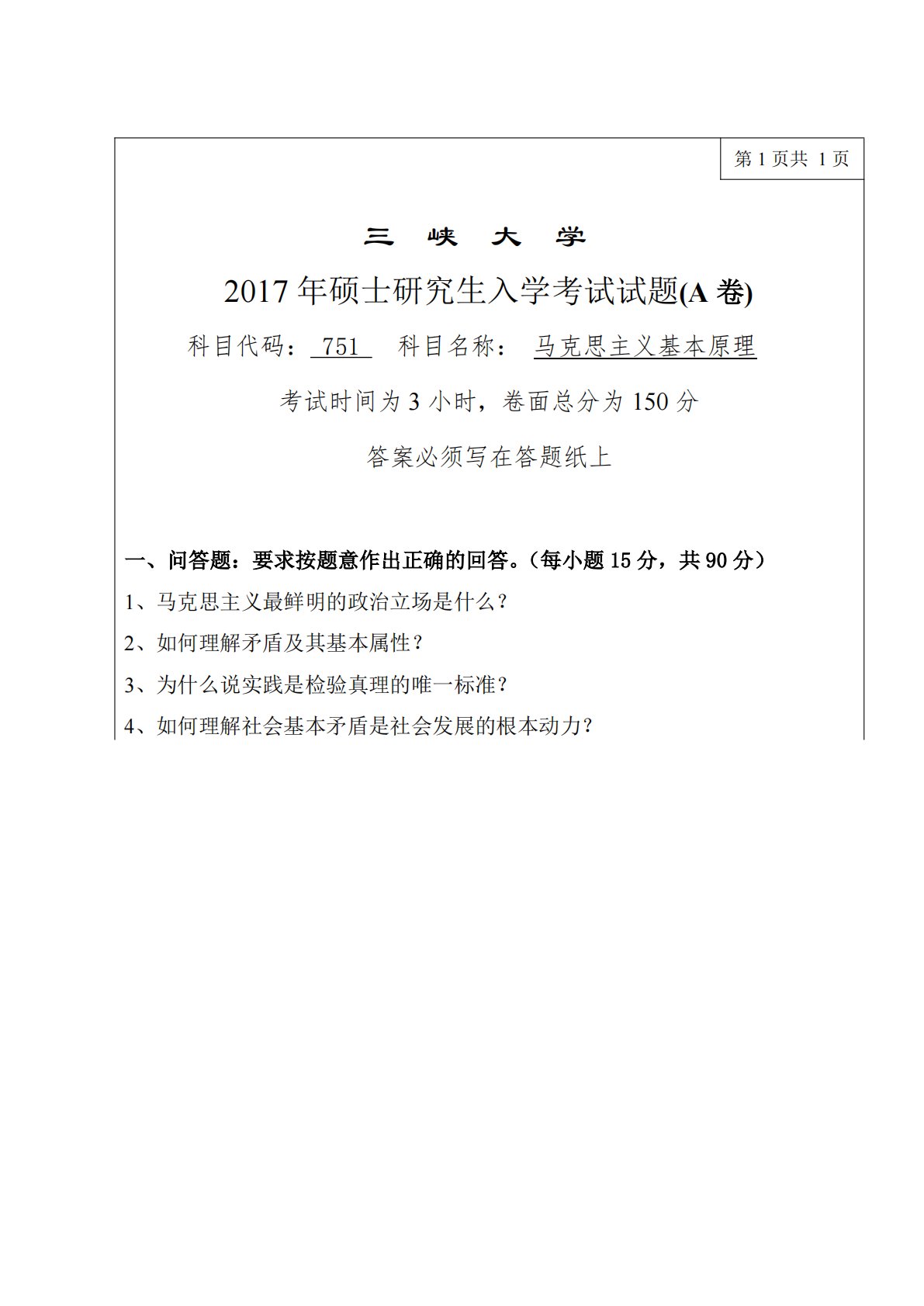 第1页共1页三峡大学2017年硕士研究生入学考试试题(A卷)科目代码:751科目名称:马克思主义基本原理考试时间为3小时,卷面总分为150分答案必须写在答题纸上一、问答题:要求按题意作出正确的回答。(每小题15分,共90分)1、马克思主义最鲜明的政治立场是什么?2、如何理解矛盾及其基本属性?3、为什么说实践是检验真理的唯一标准?4、如何理解社会基本矛盾是社会发展的根本动力?1第1页共1页三峡大学2017年硕士研究生入学考试试题(A卷)科目代码:751科目名称:马克思主义基本原理考试时间为3小时,卷面总分为150分答案必须写在答题纸上一、问答题:要求按题意作出正确的回答。(每小题15分,共90分...