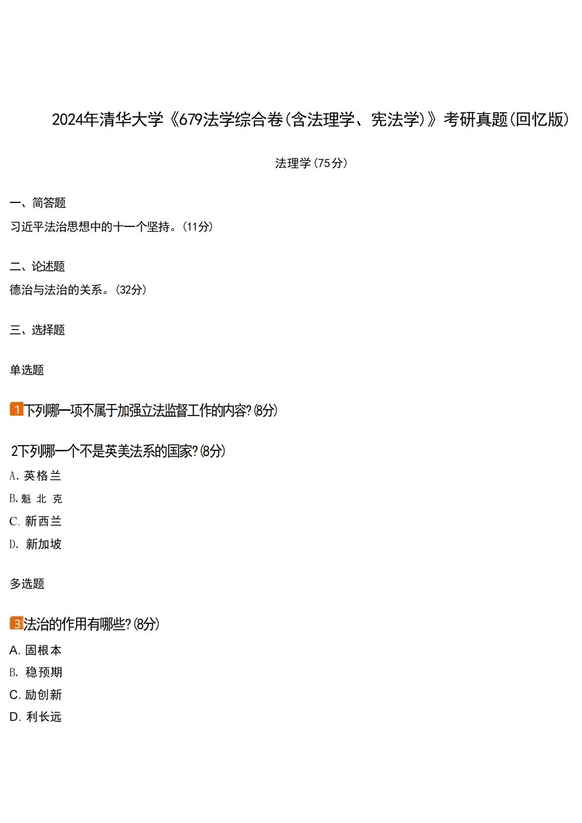 清华大学679法学综合卷(含法理学、宪法学)2024年真题回忆版