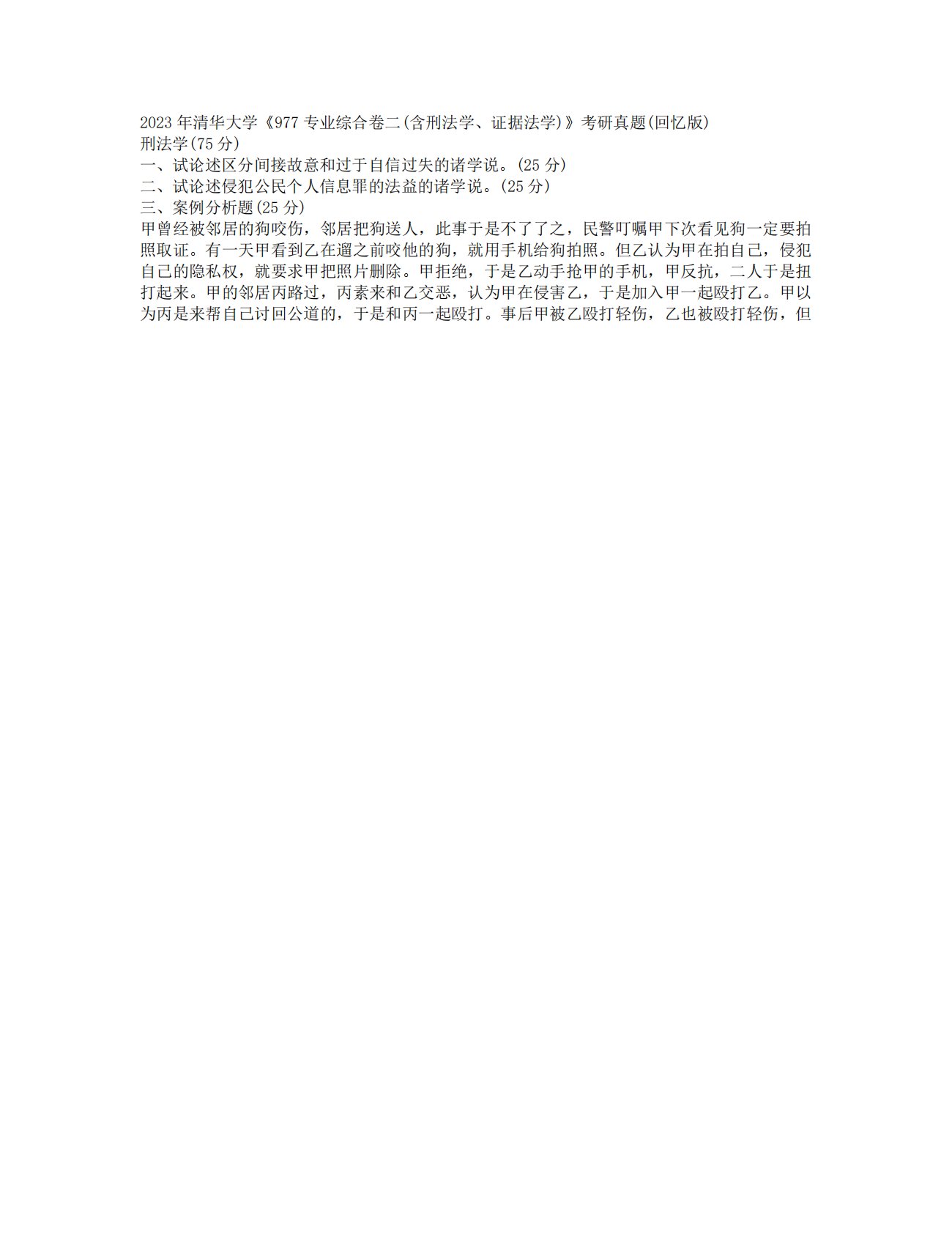 2023年清华大学《977专业综合卷二(含刑法学、证据法学)》考研真题(回忆版)刑法学(75分)一、试论述区分间接故意和过于自信过失的诸学说。(25分)二、试论述侵犯公民个人信息罪的法益的诸学说。(25分)三、案例分析题(25分)甲曾经被邻居的狗咬伤,邻居把狗送人,此事于是不了了之,民警叮嘱甲下次看见狗一定要拍照取证。有一天甲看到乙在遛之前咬他的狗,就用手机给狗拍照。但乙认为甲在拍自己,侵犯自己的隐私权,就要求甲把照片删除。甲拒绝,于是乙动手抢甲的手机,甲反抗,二人于是扭打起来。甲的邻居丙路过,丙素来和乙交恶,认为甲在侵害乙,于是加入甲一起殴打乙。甲以为丙是来帮自己讨回公道的,于是和丙一起殴打...