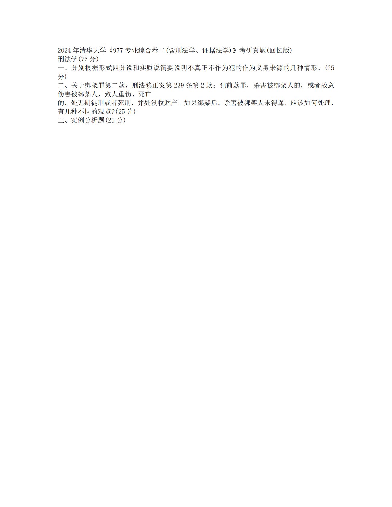 2024年清华大学《977专业综合卷二(含刑法学、证据法学)》考研真题(回忆版)刑法学(75分)一、分别根据形式四分说和实质说简要说明不真正不作为犯的作为义务来源的几种情形。(25分)二、关于绑架罪第二款,刑法修正案第239条第2款:犯前款罪,杀害被绑架人的,或者故意伤害被绑架人,致人重伤、死亡的,处无期徒刑或者死刑,并处没收财产。如果绑架后,杀害被绑架人未得逞,应该如何处理,有几种不同的观点?(25分)三、案例分析题(25分)2024年清华大学《977专业综合卷二(含刑法学、证据法学)》考研真题(回忆版)刑法学(75分)一、分别根据形式四分说和实质说简要说明不真正不作为犯的作为义务来源的几种...