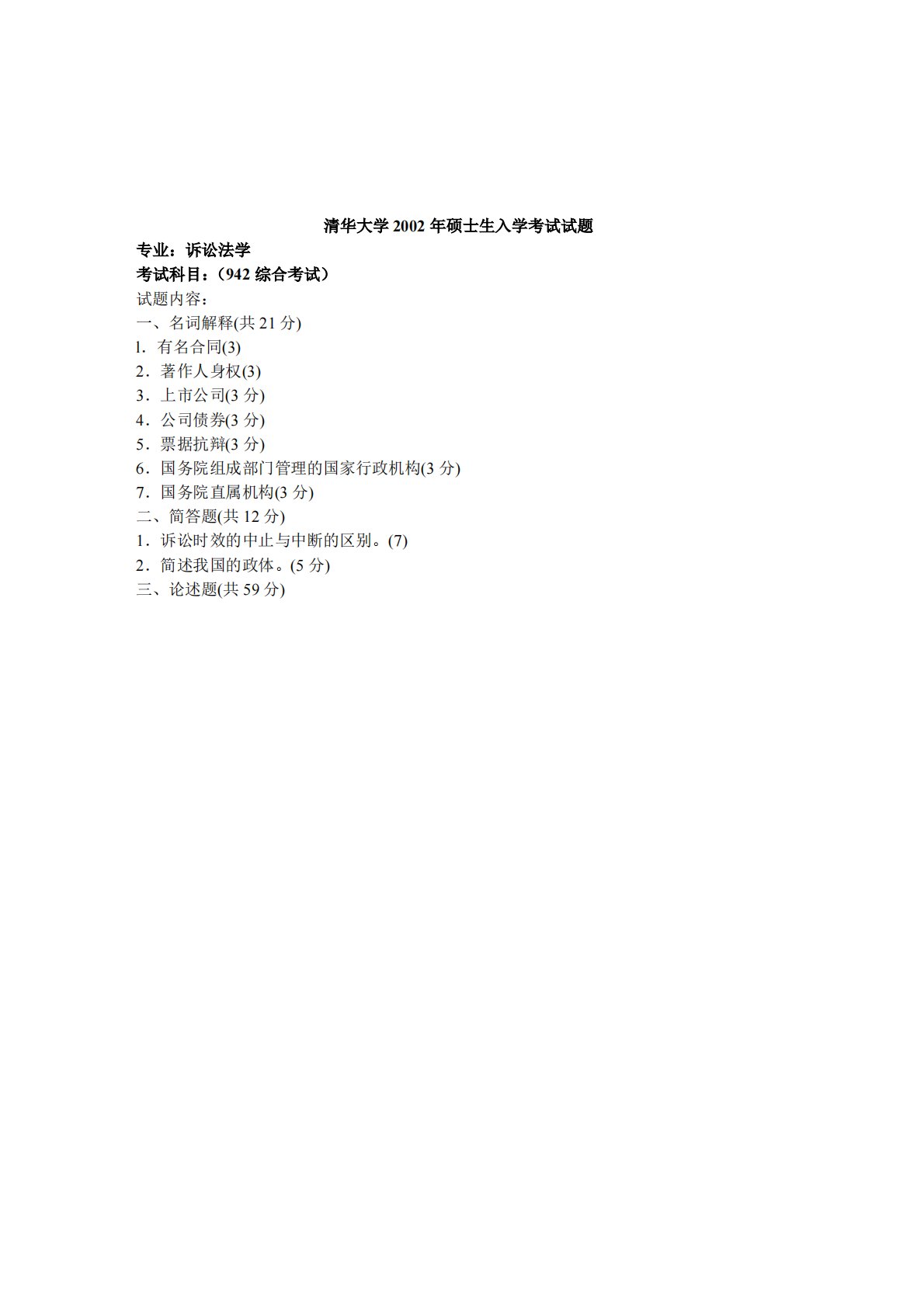 清华大学2002年硕士生入学考试试题专业:诉讼法学考试科目:(942综合考试)试题内容:一、名词解释(共21分)l.有名合同(3)2.著作人身权(3)3.上市公司(3分)4.公司债券(3分)5.票据抗辩(3分)6.国务院组成部门管理的国家行政机构(3分)7.国务院直属机构(3分)二、简答题(共12分)1.诉讼时效的中止与中断的区别。(7)2.简述我国的政体。(5分)三、论述题(共59分)清华大学2002年硕士生入学考试试题专业:诉讼法学考试科目:(942综合考试)试题内容:一、名词解释(共21分)l.有名合同(3)2.著作人身权(3)3.上市公司(3分)4.公司债券(3分)5.票据抗辩(3分)...