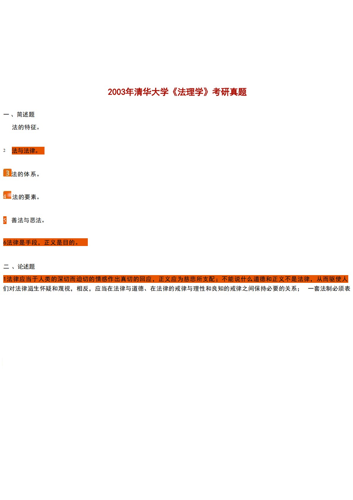 2003年清华大学《法理学》考研真题一、简述题法的特征。2法与法律。法的体系。4法的要素。5善法与恶法。6法律是手段,正义是目的。二、论述题1法律应当于人类的深切而迫切的情感作出真切的回应,正义应为慈悲所支配;不能说什么道德和正义不是法律,从而驱使人们对法律滋生怀疑和蔑视,相反,应当在法律与道德、在法律的戒律与理性和良知的戒律之间保持必要的关系;一套法制必须表2003年清华大学《法理学》考研真题一、简述题法的特征。2法与法律。法的体系。4法的要素。5善法与恶法。6法律是手段,正义是目的。二、论述题1法律应当于人类的深切而迫切的情感作出真切的回应,正义应为慈悲所支配;不能说什么道德和正义不是法律...