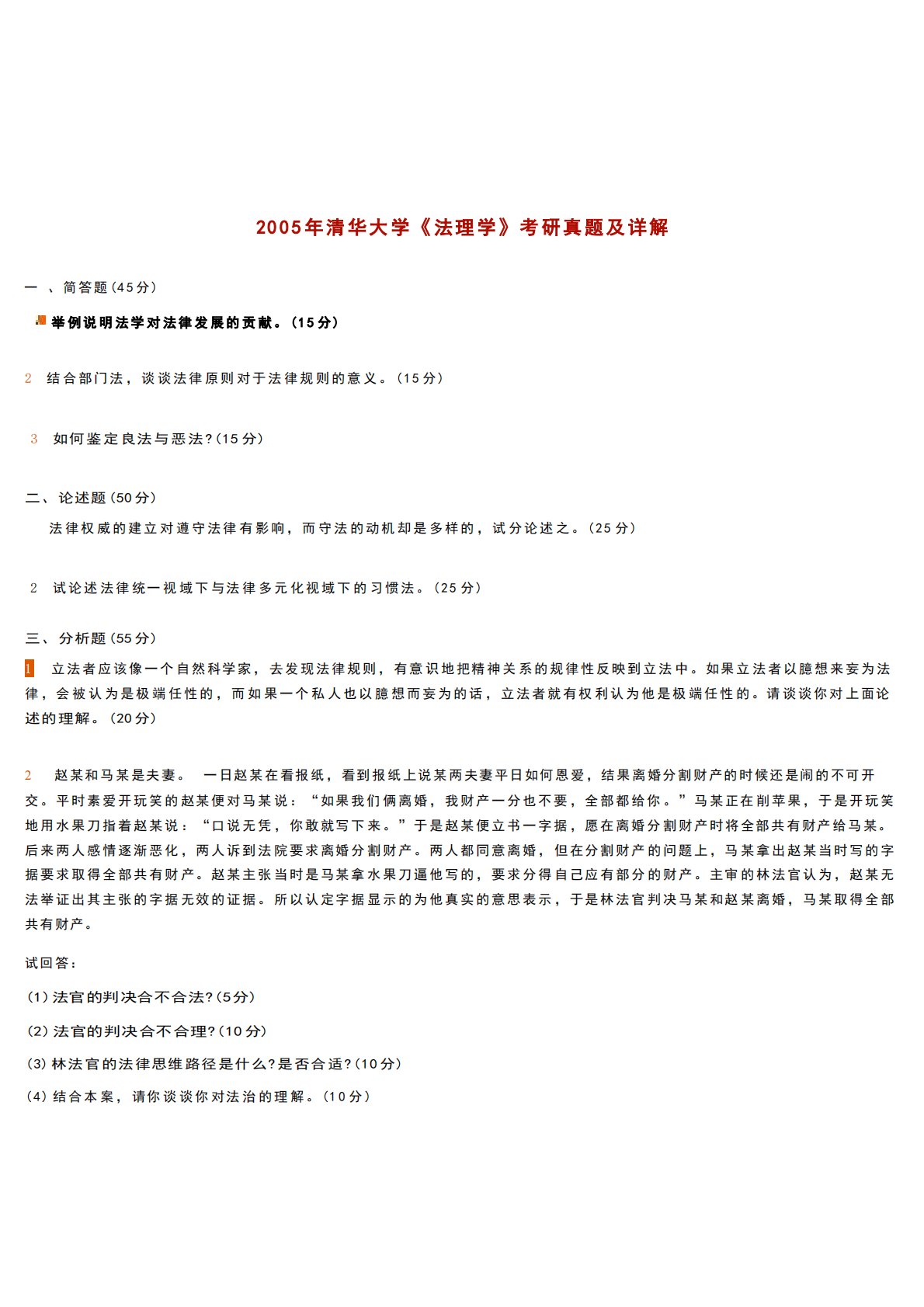 2005年清华大学《法理学》考研真题及详解一、简答题(45分)举例说明法学对法律发展的贡献。(15分)2结合部门法,谈谈法律原则对于法律规则的意义。(15分)3如何鉴定良法与恶法?(15分)二、论述题(50分)法律权威的建立对遵守法律有影响,而守法的动机却是多样的,试分论述之。(25分)2试论述法律统一视域下与法律多元化视域下的习惯法。(25分)三、分析题(55分)1立法者应该像一个自然科学家,去发现法律规则,有意识地把精神关系的规律性反映到立法中。如果立法者以臆想来妄为法律,会被认为是极端任性的,而如果一个私人也以臆想而妄为的话,立法者就有权利认为他是极端任性的。请谈谈你对上面论述的理解。(...