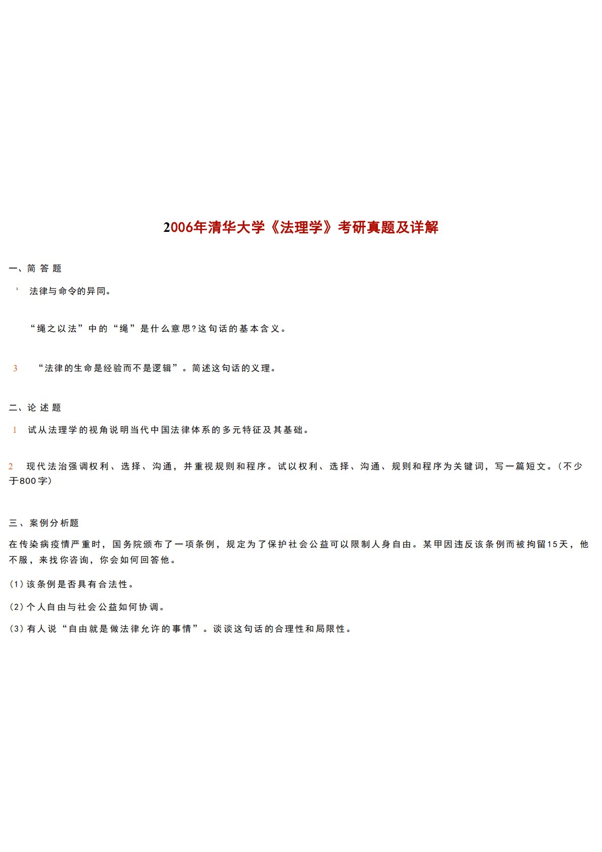 2006年清华大学《法理学》考研真题及详解一、简答题1法律与命令的异同。“绳之以法”中的“绳”是什么意思?这句话的基本含义。3“法律的生命是经验而不是逻辑”。简述这句话的义理。二、论述题1试从法理学的视角说明当代中国法律体系的多元特征及其基础。2现代法治强调权利、选择、沟通,并重视规则和程序。试以权利、选择、沟通、规则和程序为关键词,写一篇短文。(不少于800字)三、案例分析题在传染病疫情严重时,国务院颁布了一项条例,规定为了保护社会公益可以限制人身自由。某甲因违反该条例而被拘留15天,他不服,来找你咨询,你会如何回答他。(1)该条例是否具有合法性。(2)个人自由与社会公益如何协调。(3)有人...